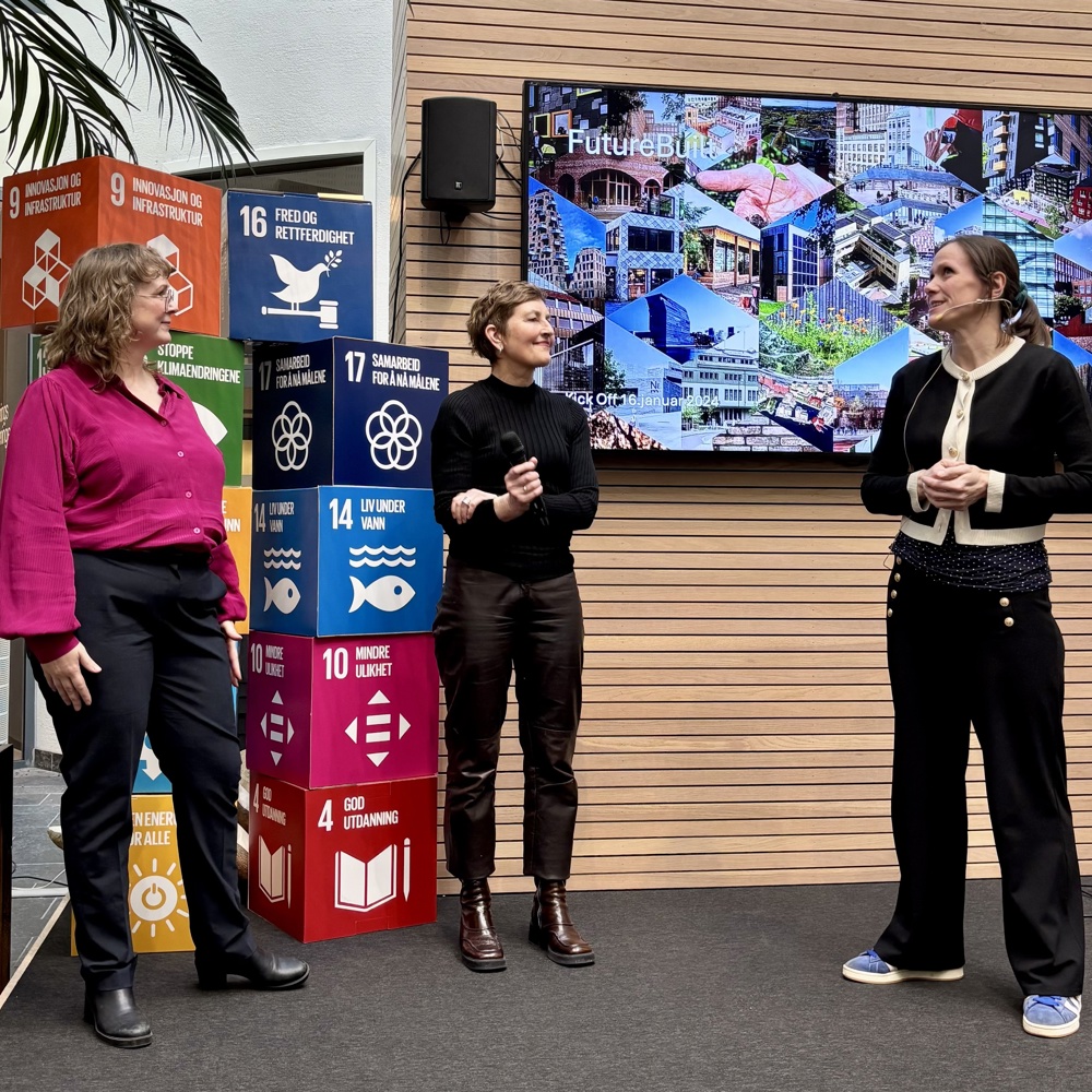 Kristiansand er nyeste Futurebuilt-kommune i landet. Her midlertidig prosjektleder Hanna E. Marcussen (t.h.), tidligere byråd i Oslo og MDG-leder, Solveig Nilsen (Bølgen bærekraftsenter) og Birgit Rusten (Futurebuilt).