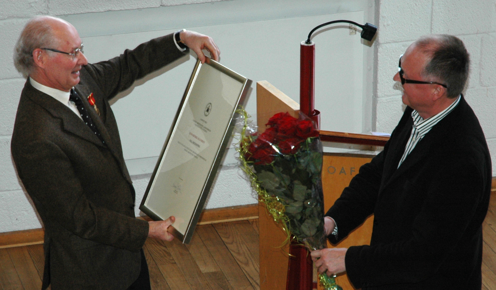 Halvorsen mottok NALs hederspris da han i 2006 gikk av med pensjon. Til høyre den gang nylig avgått president, Gudmund Stokke.