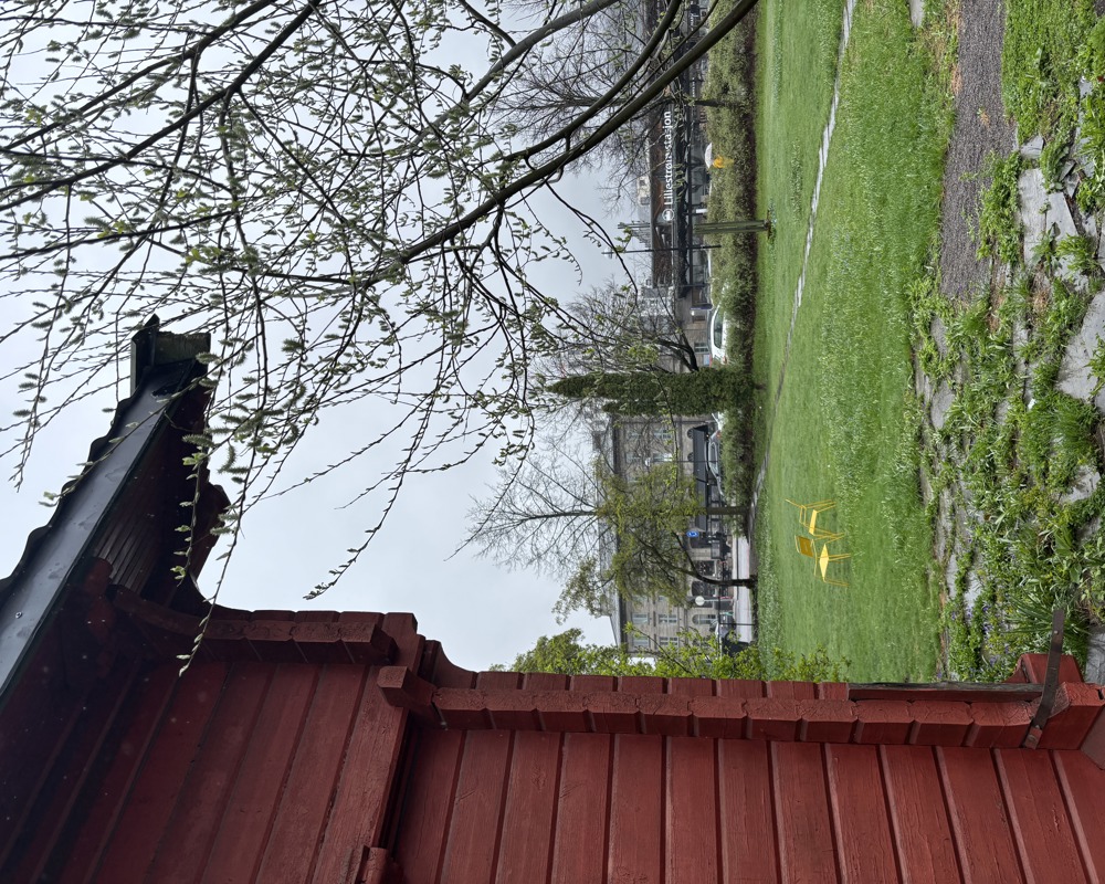 Stabburet på det gamle tunet i Kirkegata 8 foran den grønne hagen som i dag er offentlig park. Stasjonsbygget på Lillestrøm i bakgrunnen.