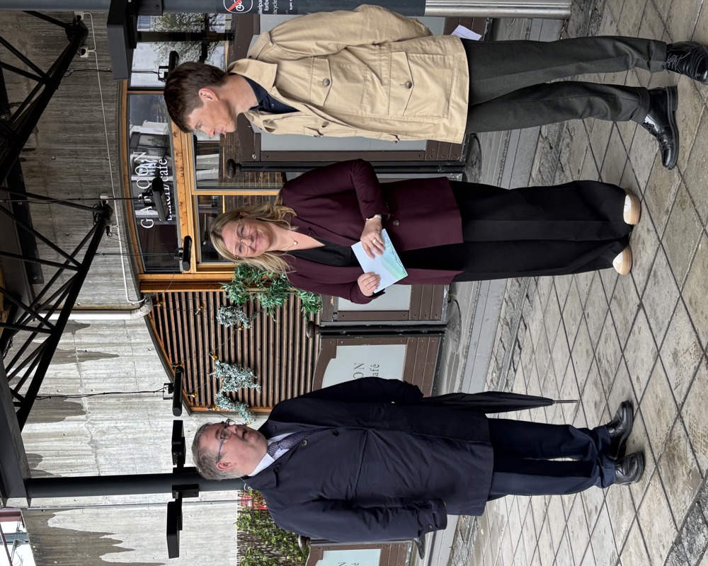 Ordfører Kjartan Berland (H), statsråd Kjersti Stenseng (Ap) og byarkitekt Halvor Kloster åpnet byvandringen foran Garçon bakeri og café på sørsiden av Lillestrøm stasjon.