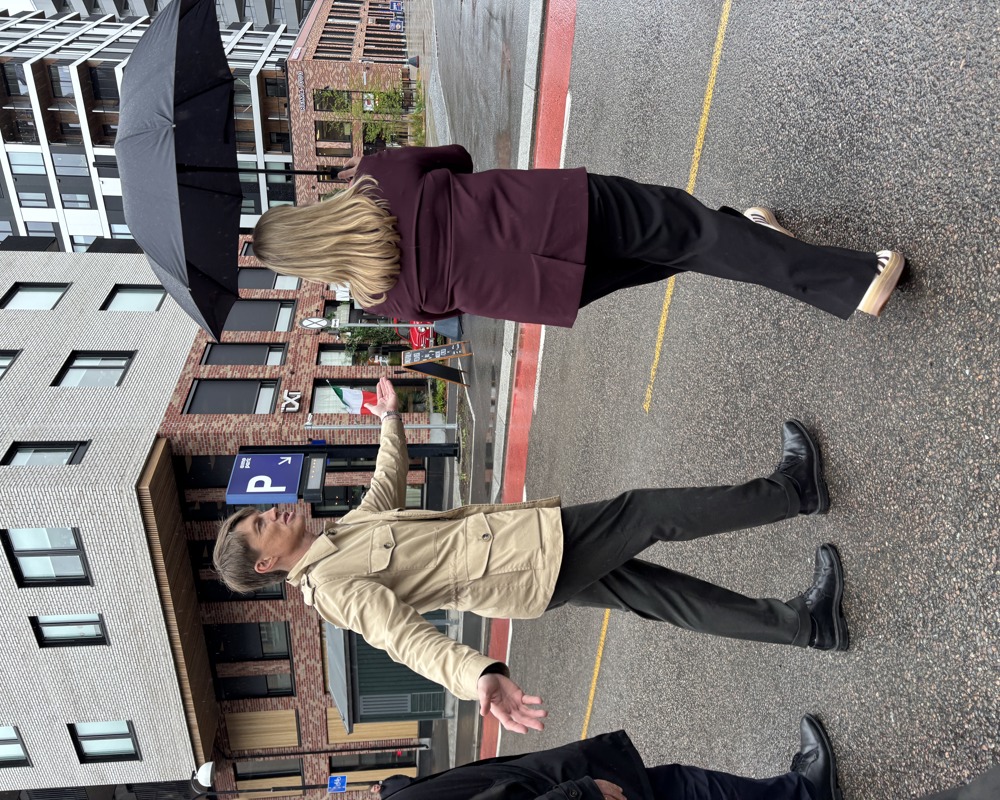 Kjersti Stenseng får mange ivrige innspill fra byarkitekt Halvor Kloster på byvandring i Lillestrøms gater. – Her er det ingen sammenheng, sier Kloster om øst-vest-aksen langs Sørumsgata.