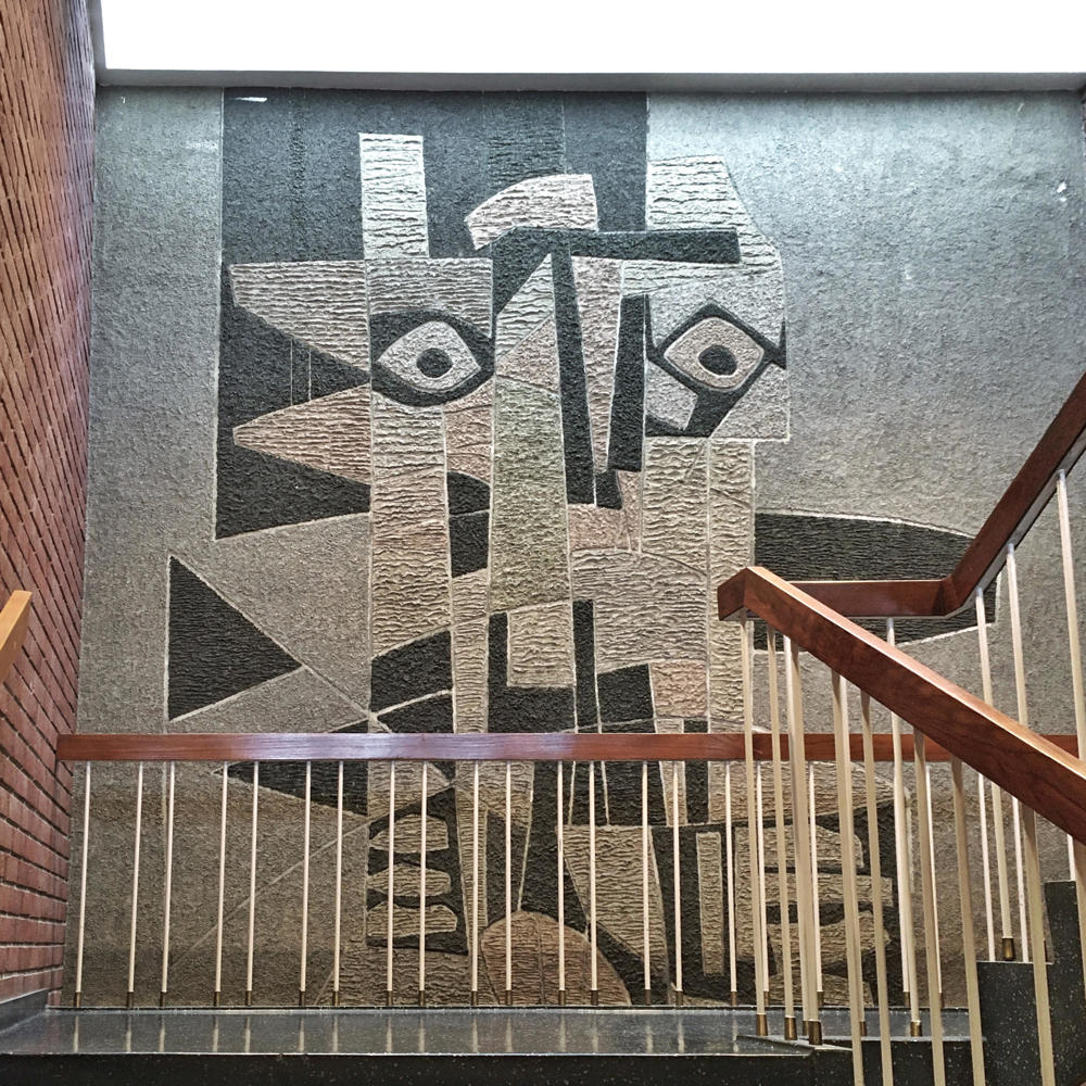 Kunstverk av Andreas Bø i det gamle politihuset. Bildet viser kun den øverste delen. Verket går over tre etasjer i trappehuset, med naturlig lys ovenfra.
