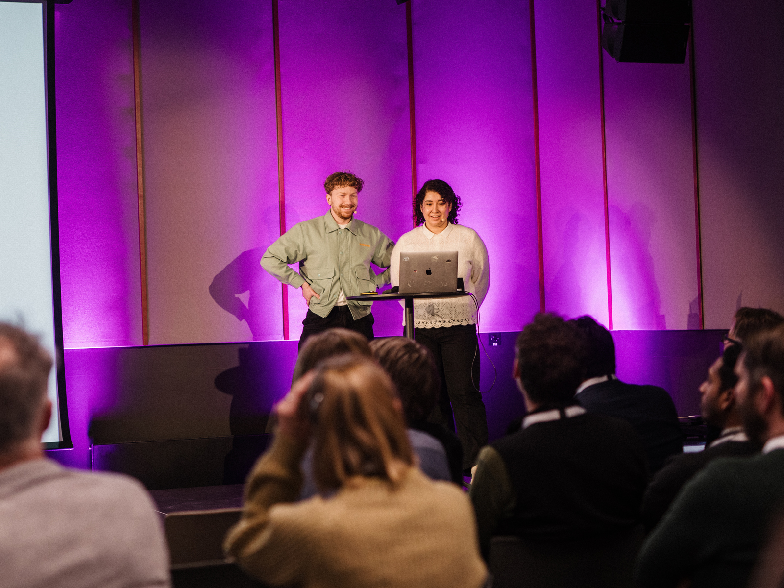 Torkel Englund (t.v.) og Fatin Radi på scenen under Arkitektbedriftenes KI-konferanse.