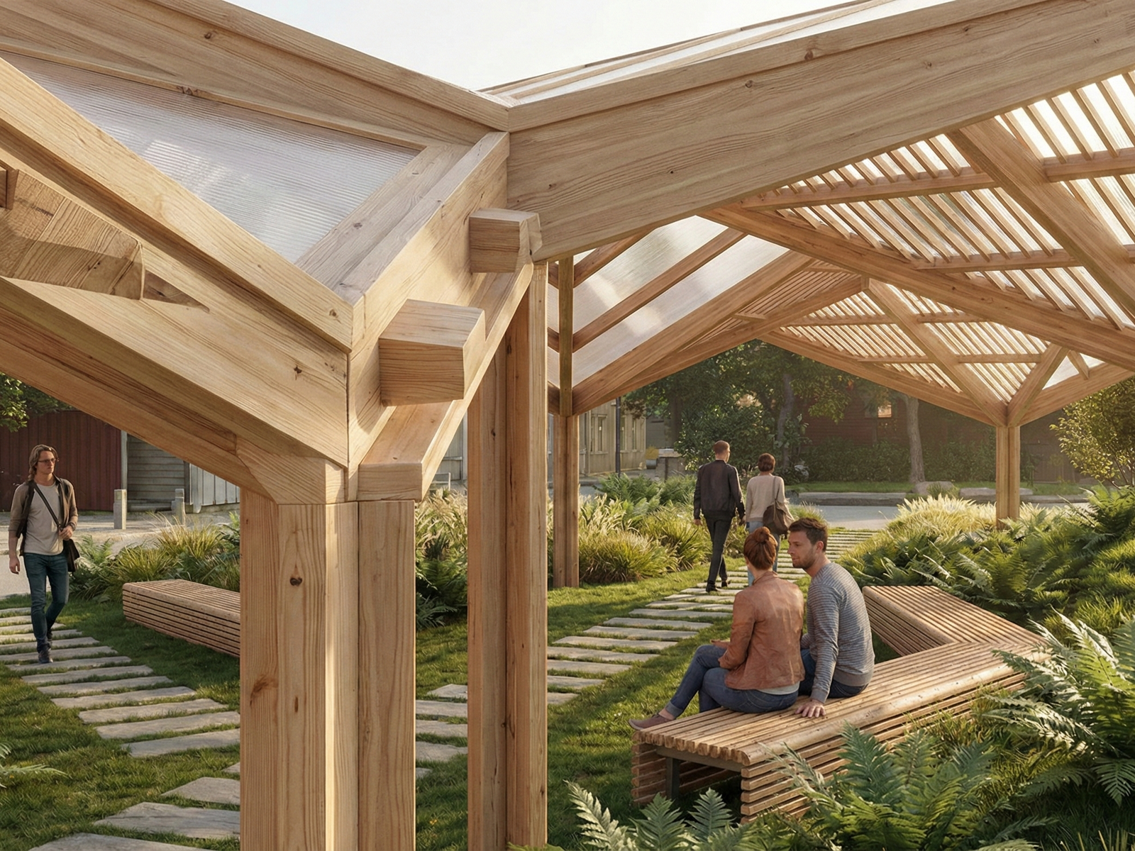 Forslaget er en forenklet trekonstruksjon med mye potensial som offentlig møterom, mener Radi og Englund. De syntes den føltes litt som en lekeplass for voksne (i best mulig tolkning).Den er åpen og luftig, men mangler fortsatt noe som gjør den unik.
