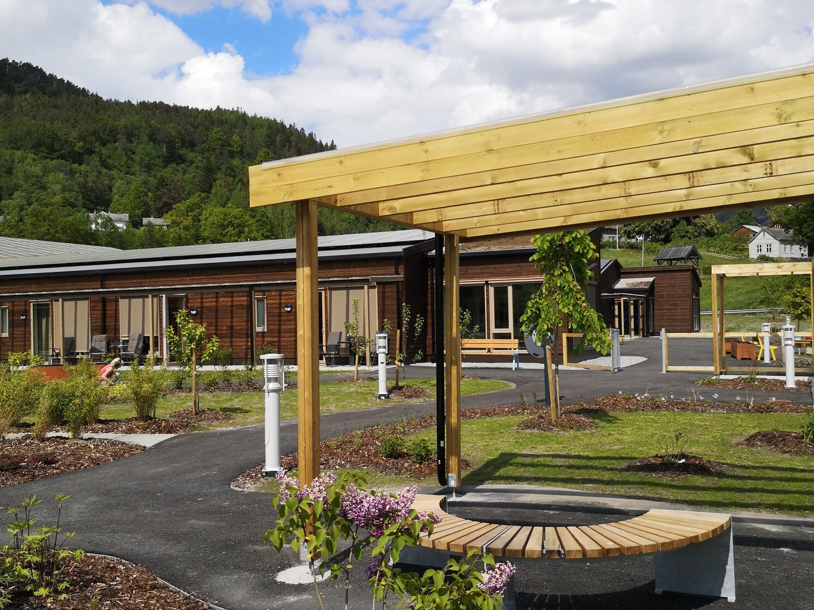 Strandebarm omsorgssenter består av 26 boenheter i tillegg til dagsenterfunksjon. Landskapet er opparbeidet med en sansehage og flere oppholdssoner som stumulerer til aktivitet.