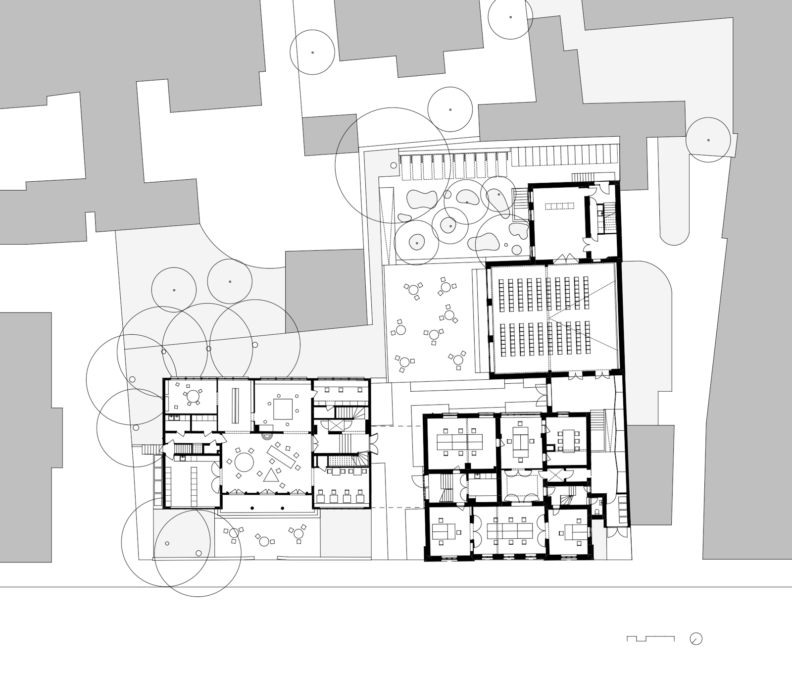 Plan første etasje med utomhus. Hovedgrepene handler om å tydeliggjøre innganger og program, og skape generelle og gode rom for både besøkende og arbeidsplasser.