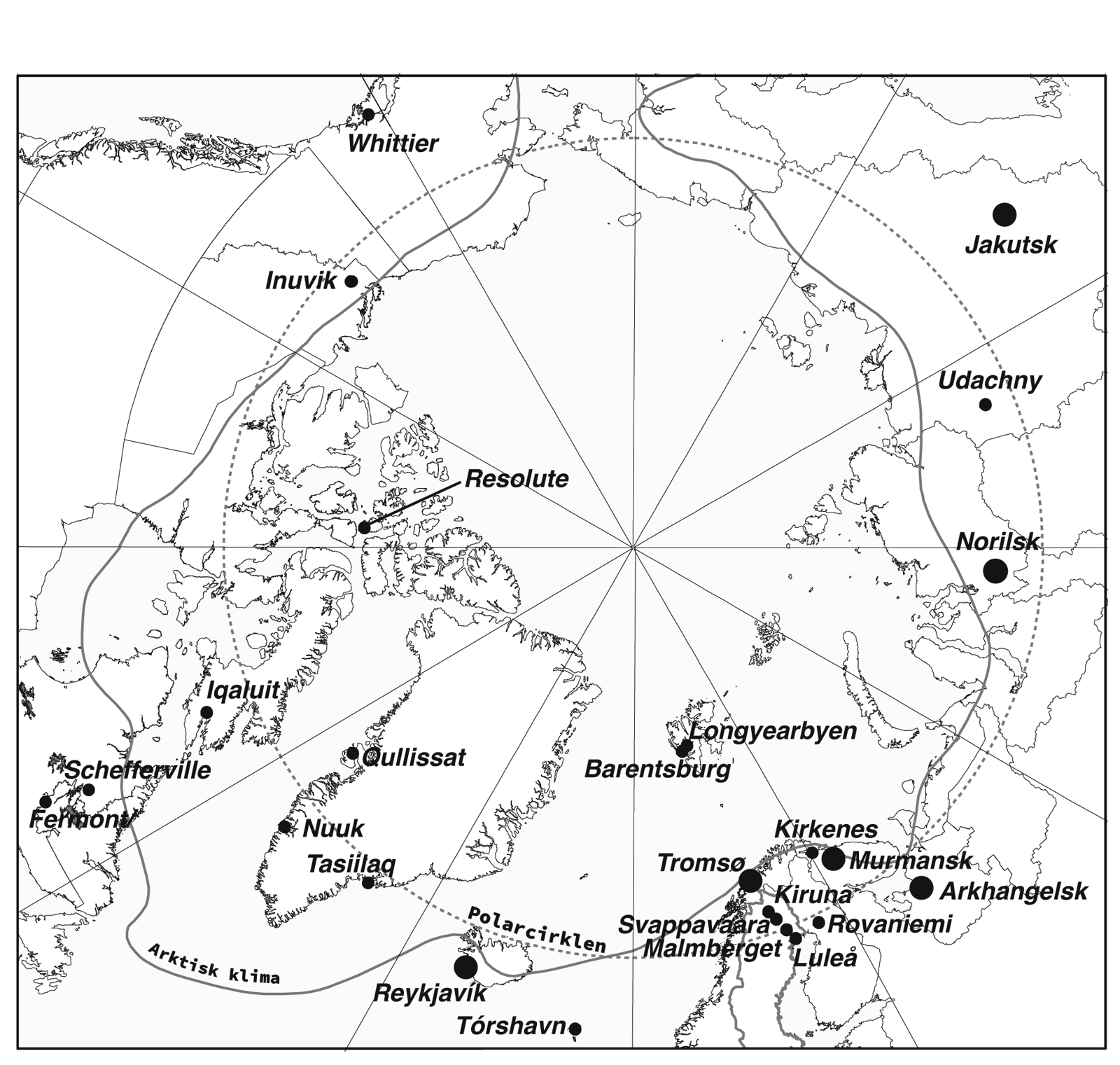 Kartet viser hvordan grensene for polarsirkelen og den arktiske klimasonen er ulike, og hvordan det påvirker de arktiske byene.
