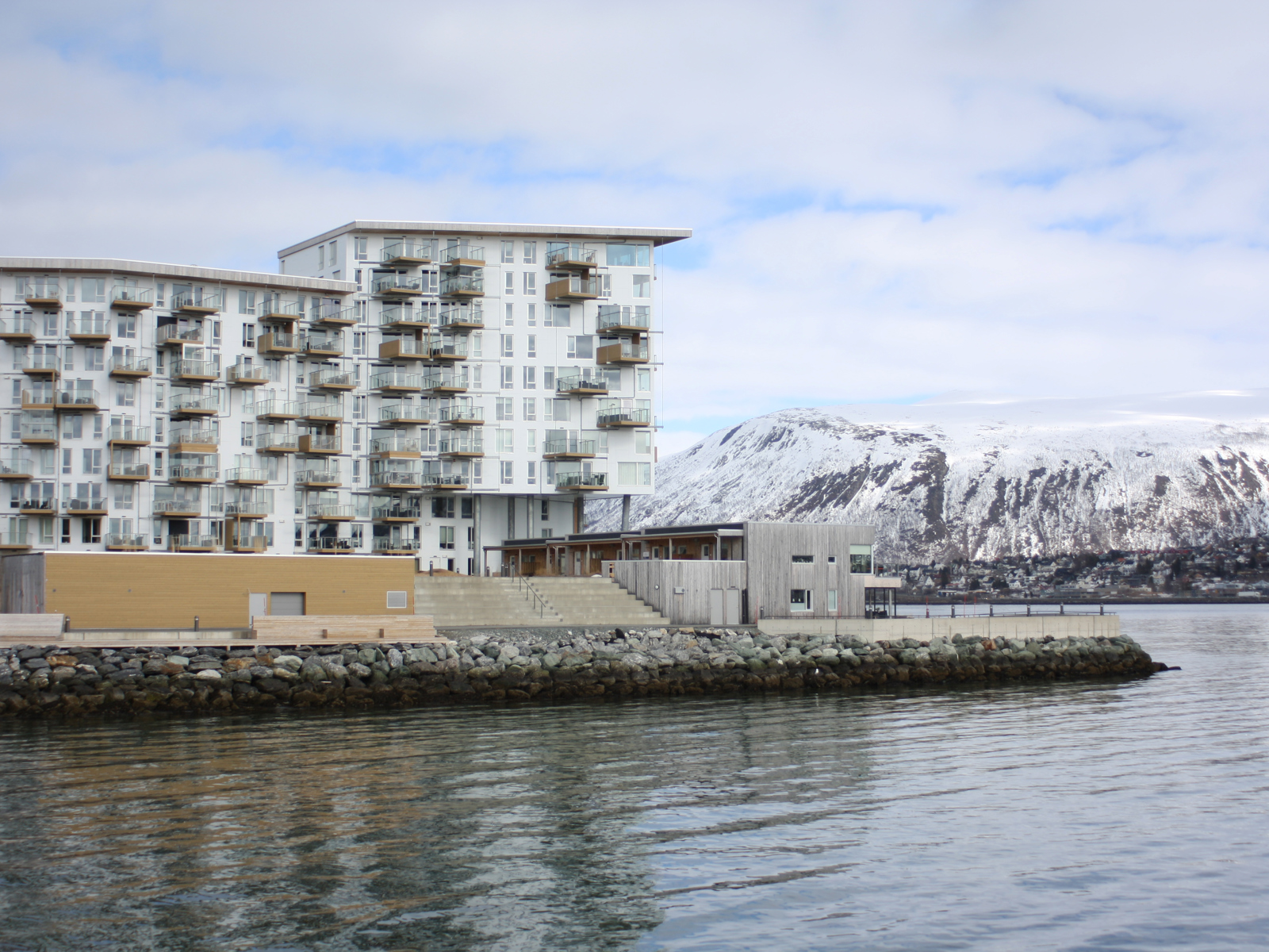 Kommer du gående langs vannet fra helt sør på Tromsøya, møter boligbebyggelsen på Strandkanten deg som en vegg.