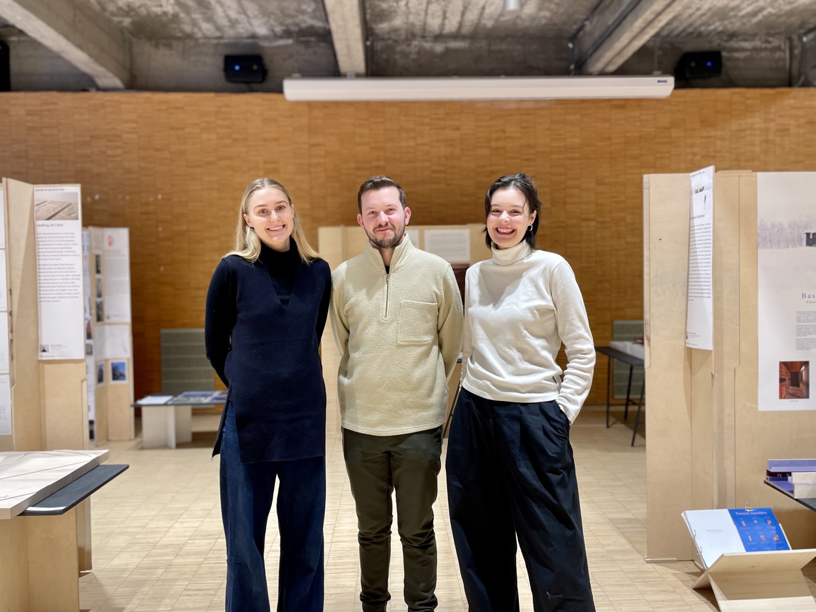 Elise Berg Tichy, Knut Nikolai Sæter og Anne Lise Lizcano Ladegård i utstillingsrommet A1 på Arkitektur- og designhøgskolen i Oslo.