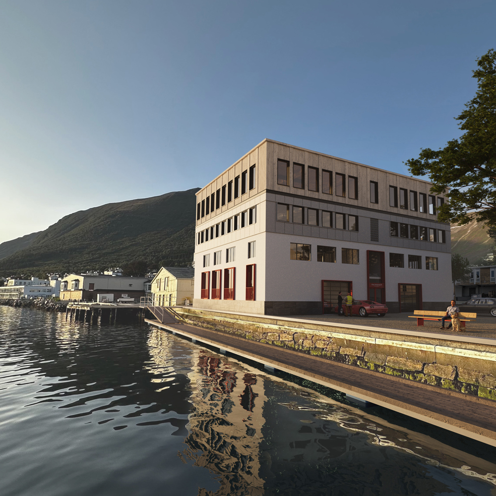 Bygget diplomstudent Knut Nikolai Sæter har jobbet med ligger på kaikanten i Ørsta. Prosjektet handler både om transformasjon og klimatilpasning. Her rendering av fasaden til det nye Kaihuset sett fra fjorden.
