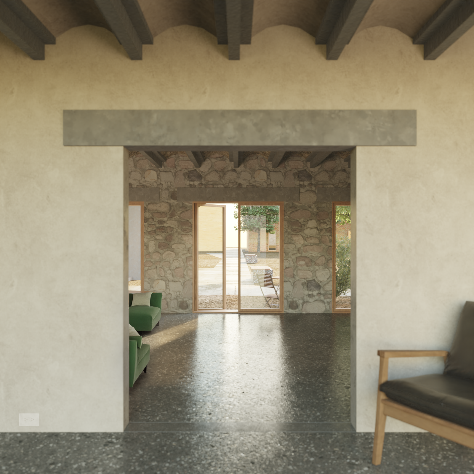 Interiørstudie som utforsker hvordan ruiner kan brukes synlig i gjenoppbyggingen. Et forsøk på å finne en balanse der sporene av det som har vært er til stede, uten å oppleves overveldende.
