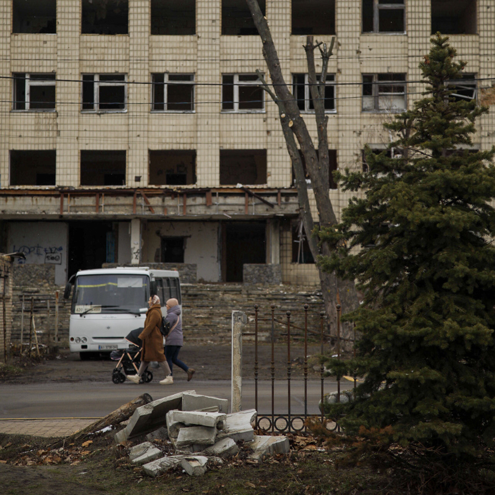 Livet går videre i Irpin utenfor Kyiv. En familie med barnevogn passerer ruiner uten å se seg tilbake.