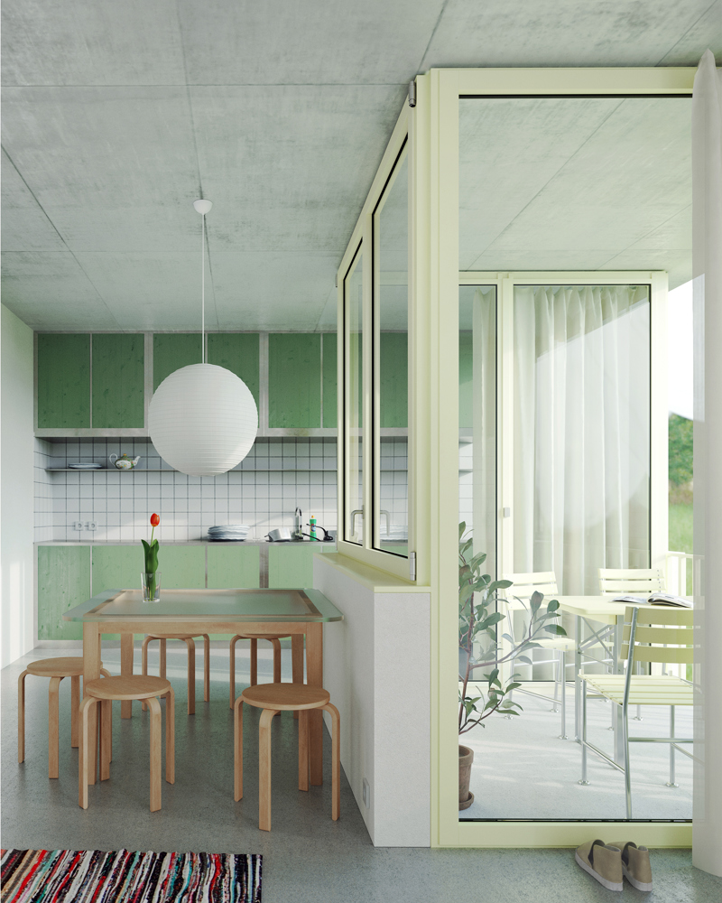 Fra utstillingen «Minstekravets laboratorium», som viser studentenes illustrasjoner til leilighetene de designet.