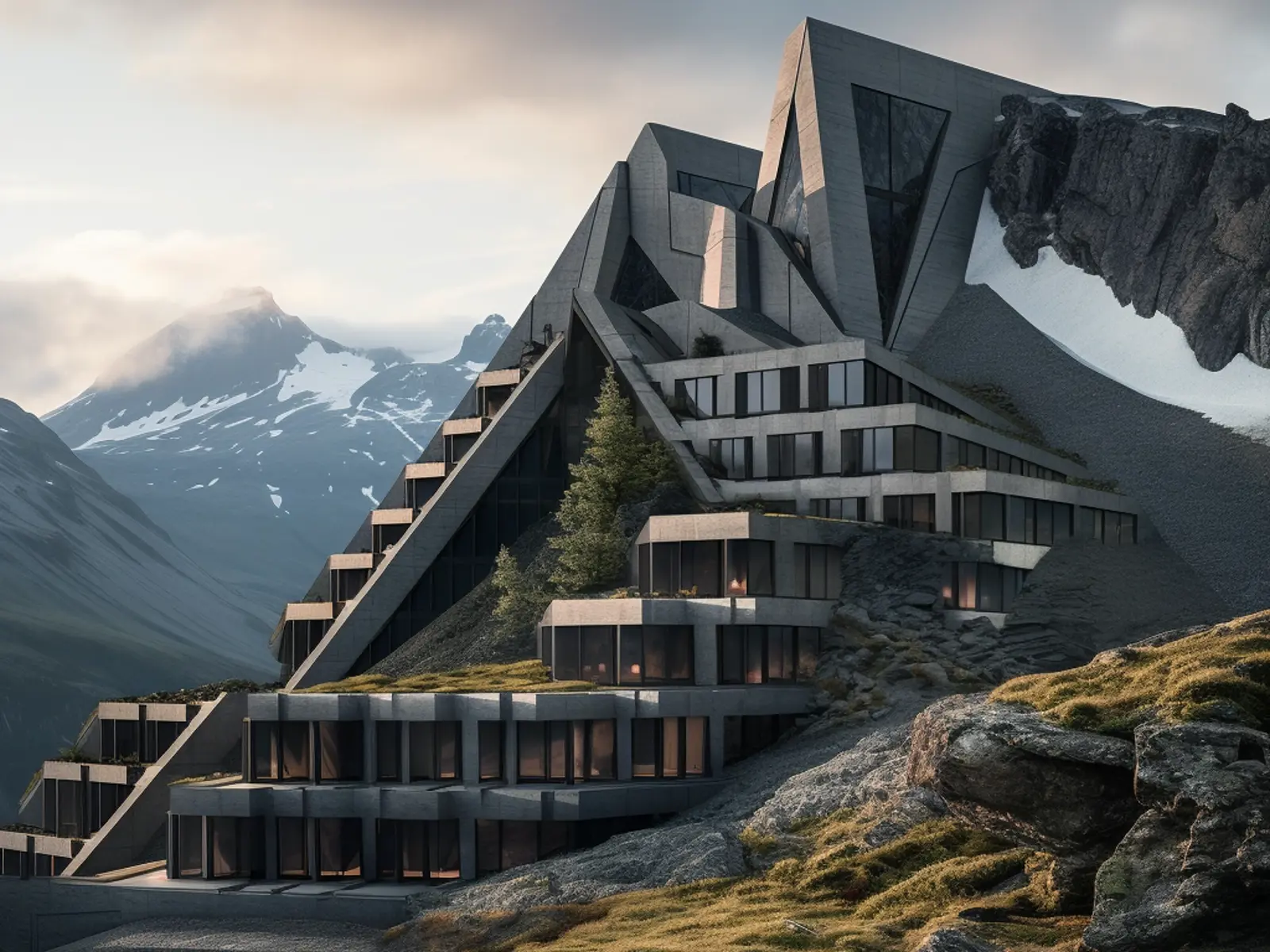 Et brutalistisk høyfjellshotell i Jotunheimen? Hvorfor ikke, sier KI-verktøyet Midjourney.