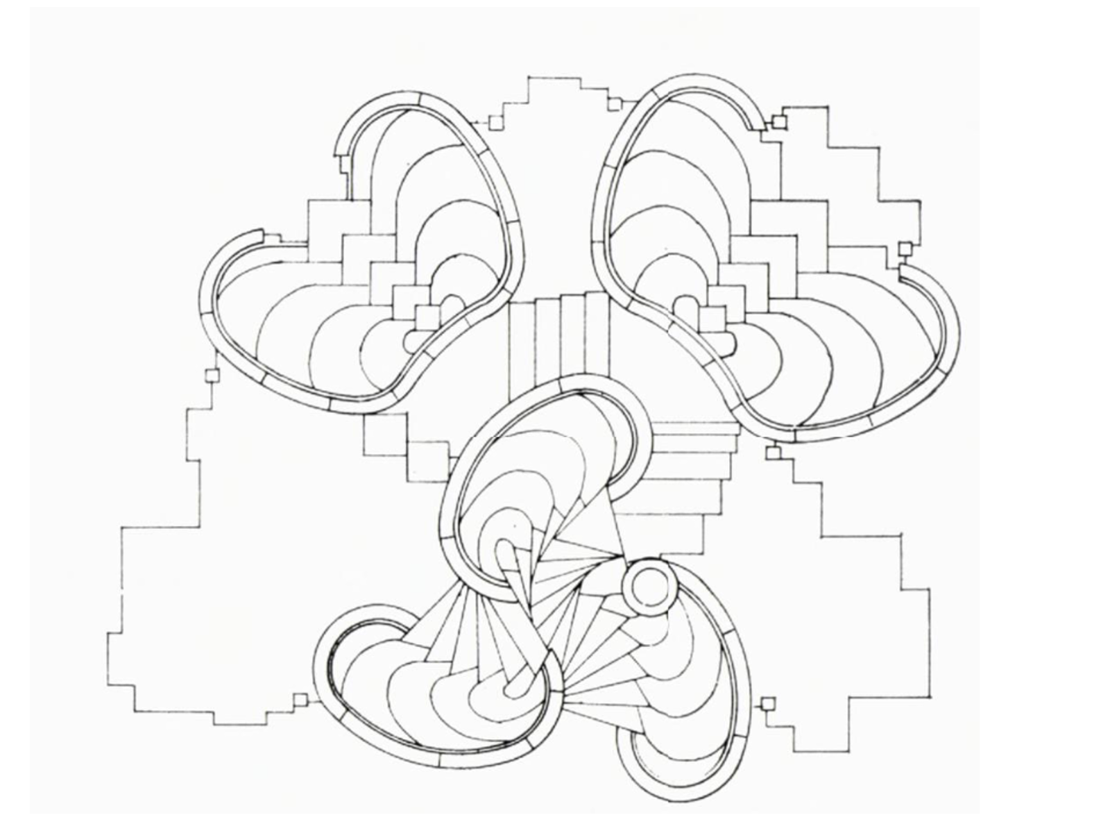 Det geometrisk-konstruktive systemet finner sin begrunnelse i de romtyper som kreves av funksjonene. I noen tilfeller er det tilstrekkelig at rommet er topologisk omsluttende uten at artikuleringen er nærmere presisert (kontorlandskap), i andre tilfeller er det klart retningsbestemt (nedkjøringsrampene etc.) eller preget av et bestemt fordelingsmønster (sekretærcellene etc.). A finne en geometrisk-teknisk fellesnevner for disse strukturene, som også muliggjør tilpasningen til omgivelsene, kan synes umulig. Portoghesi har imidlertid klart kunststykket. I stedet for å oppfatte den «åpne form» som en mekanisk cellerepetisjon, slik det idag gjerne skjer, muliggjør hans metode fortetninger, retningsforandringer og sogar innpasning av kurver. Den er derfor med rette blitt betegnet som en «geometria della libertà». Portoghesis prosjekt presenterer således et av de mest avanserte forsøk på å finne nytt arkitektonisk fotfeste.