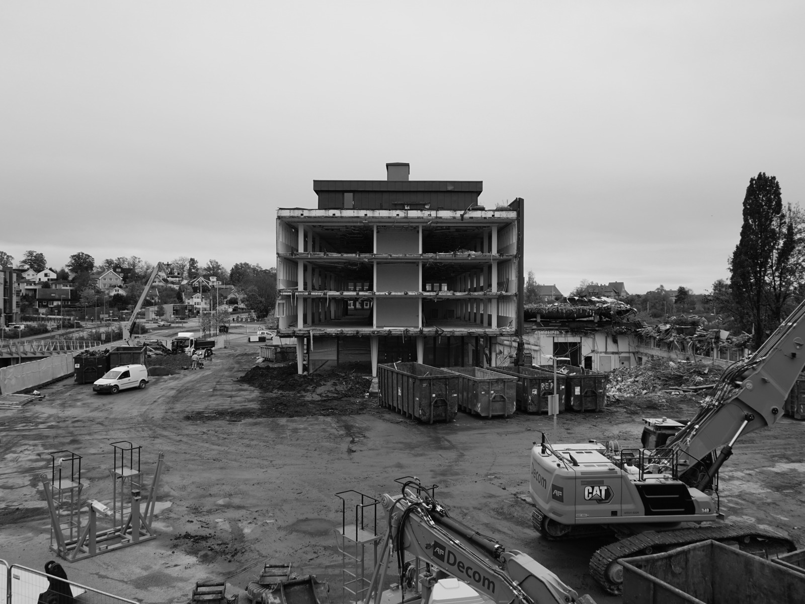 Rivningsprosessen startet høsten 2022. Mitt arbeid har resultert i en serie fotografier av rivningsprosessen mens jeg har samlet fysiske og dokumentariske bevis om bygningens historie. Som arkitektstudent har jeg lurt på hvilket verdigrunnlag som ligger bak denne sjokkerende rivningen, og hvilke verdier vi kan lære av bygningen selv i en tid da gjenbruksparadigmet er i ferd med å erstatte etterkrigstidens bruk- og kast-mentalitet.