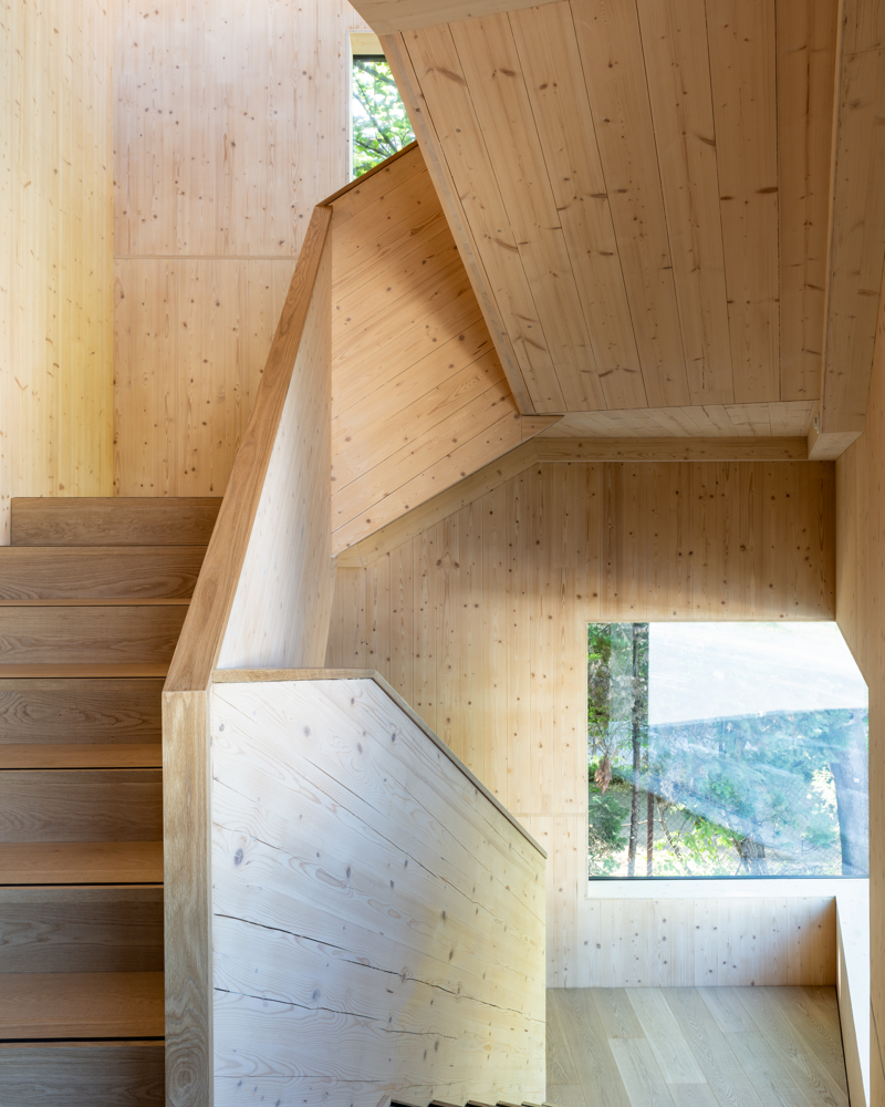 Når vi går i trappa – som med sine hjørnevinduer gir lyskvaliteter som mange stuer mangler – påpeker arkitektene sammenføyningene i trappa, hvor man ser endeveden på massivtreelementene.