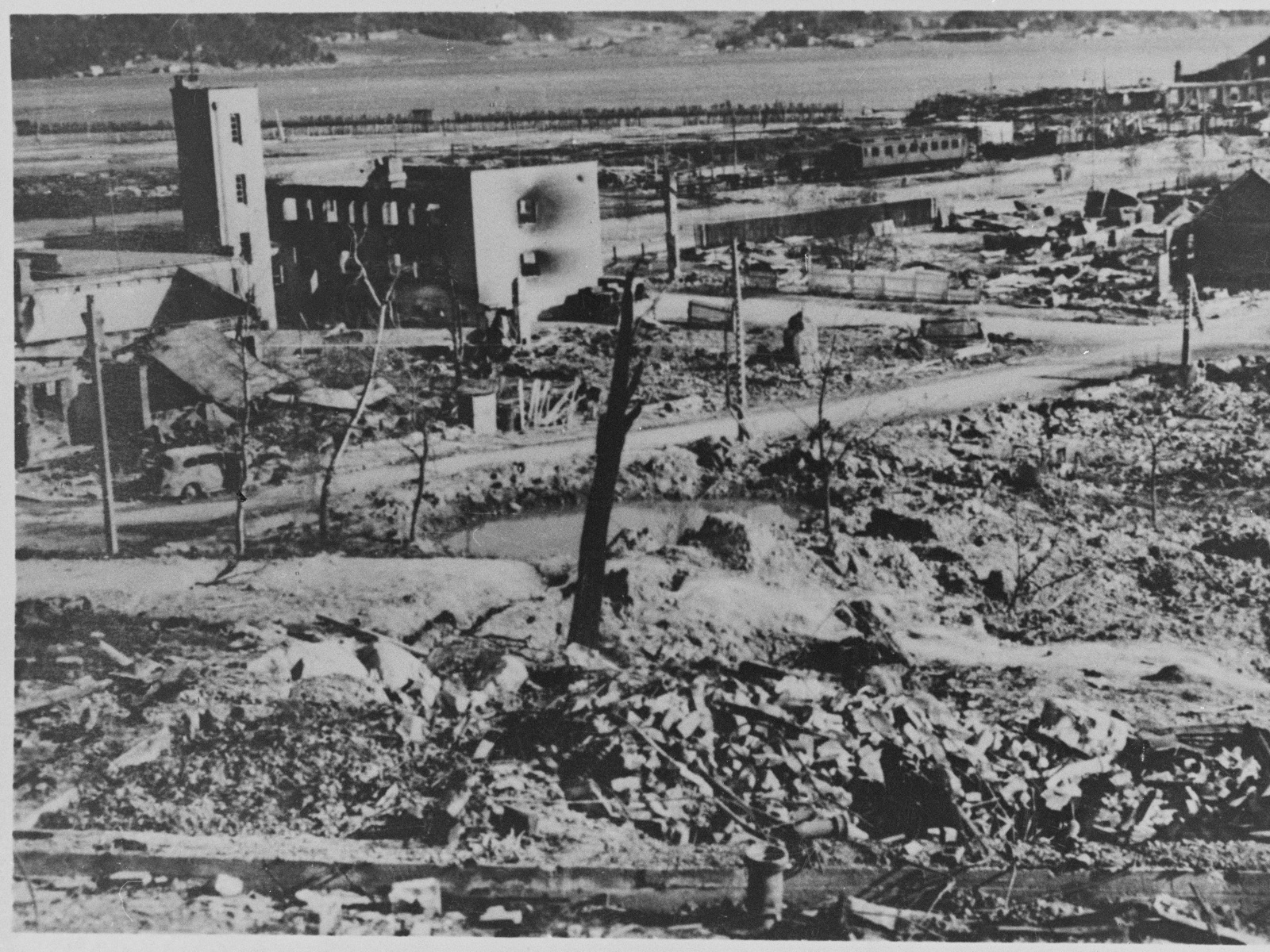 Namsos i ruiner etter tyskernes bombing i 1940. Kun noen få bygninger stod igjen, og hele byen måtte gjenreises etter krigen.