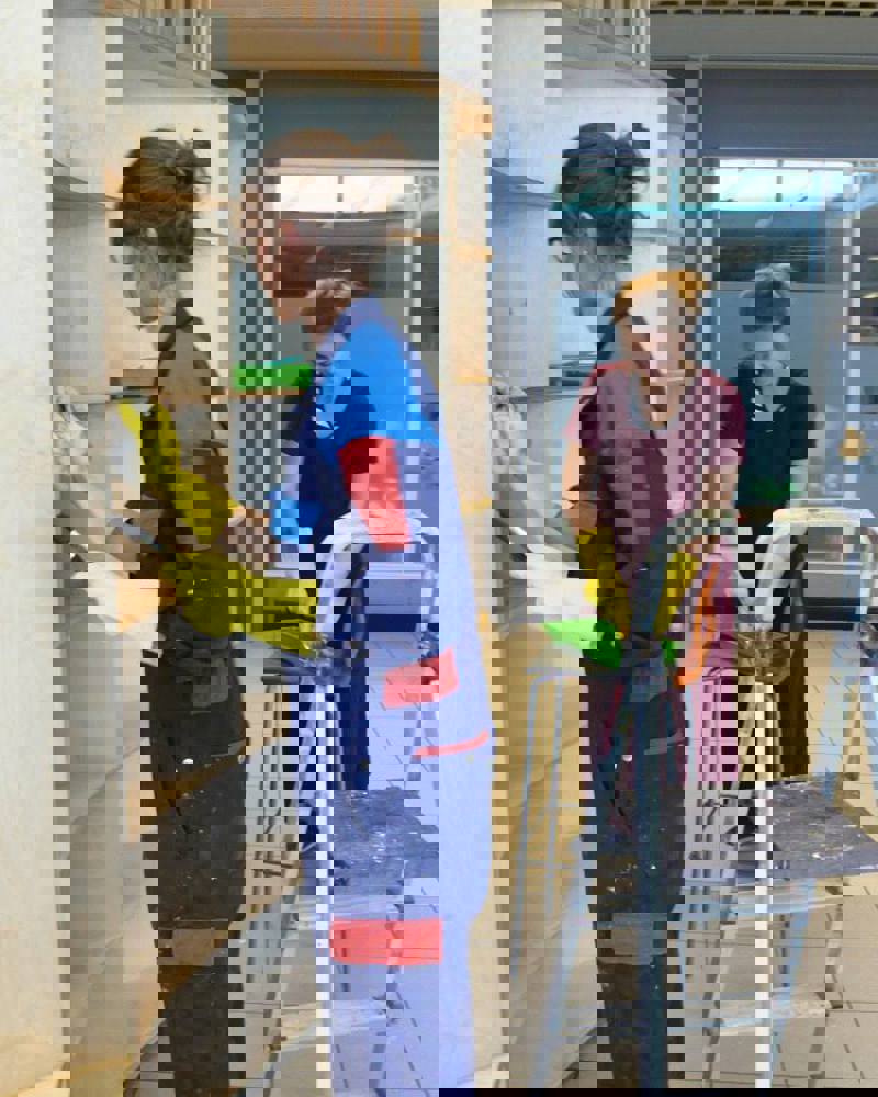 Dugnad med linoljemaling, Ulrika Staugaard og Siri Jæger Brudvik. Både amfi og bord var de- og remonterbare og bygget med gjenbruksmaterialer fra verkstedet på KHiO, av Frido Evers (kunstner) og Bjørn Jørun Blikstad (møbeldesigner).
