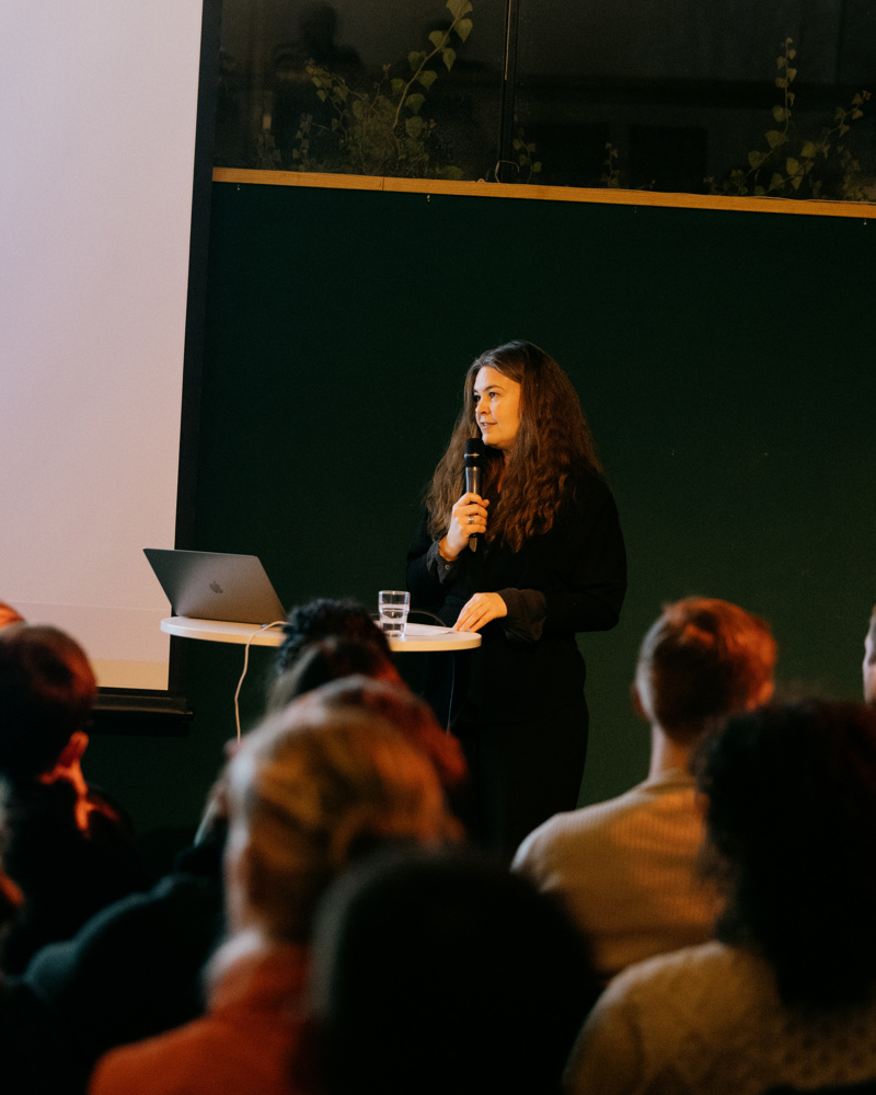 Brudvik presenterer OAFs vårprogram for 2023 i Salen på Arkitektenes hus i vinter.
