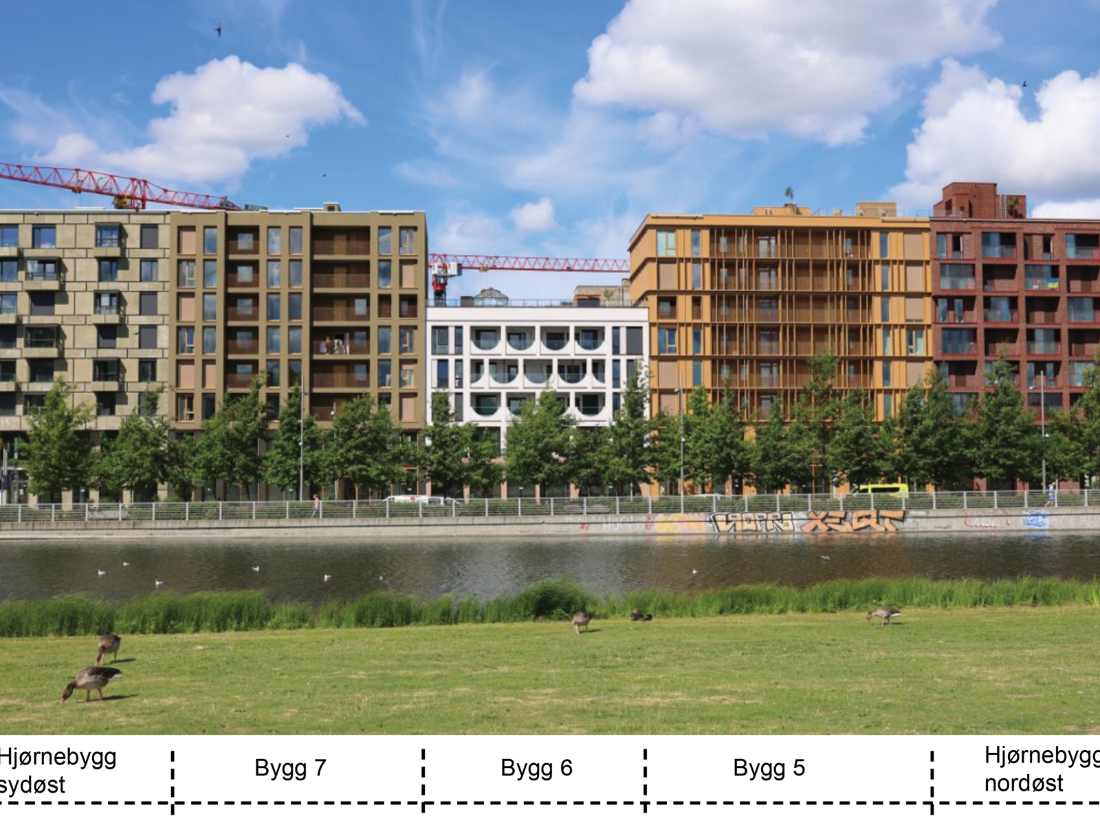 Clemenskvartalet sett fra øst, dvs. fra Middelalderparken og Ekeberg. Bygg 7, 6 og 5 er bygd over samme lest. De har hver sin trapp og heis, og atkomst til leilighetene fra svalganger.