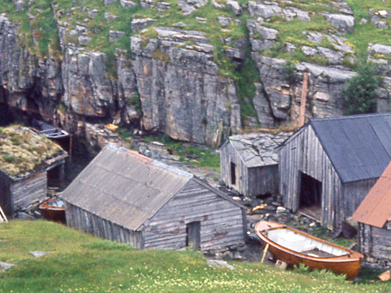 Færing og fiskeredskap klima beskyttet av vegger og tak i et nøst som en viktig del av et småbruk i Rødøy kommune i Helgeland.