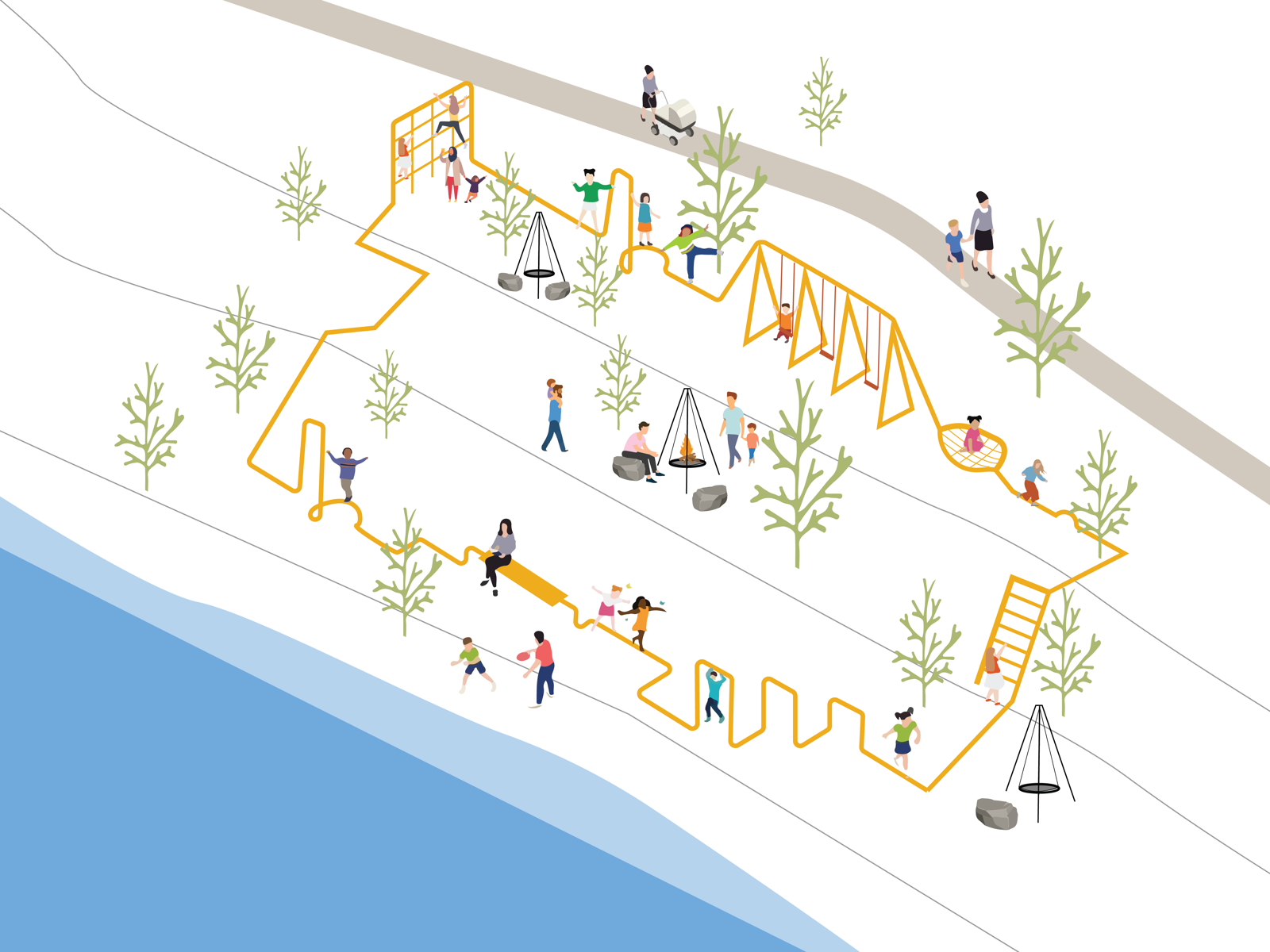 Illustrasjon: Sigrid Bjørgen/NorconsultKonseptet "Trysil-Knuten." som ble utviklet, var en balanserende tråd med aktivitetsknuter, inspirert av "Trysil-Knut" – en referanse til den kjente skilegenden Knut fra Trysil. Aktivitetsplassen ble integrert i flomvollen langs elva, og prosjektet demonstrerte hvordan tekniske løsninger som flomvern kan bidra til mer enn bare beskyttelse mot naturkreftene. Flomvolden ble et positivt innslag i sentrumsutviklingen, og viste at slike strukturer kan skape nye, verdifulle sosiale møteplasser.