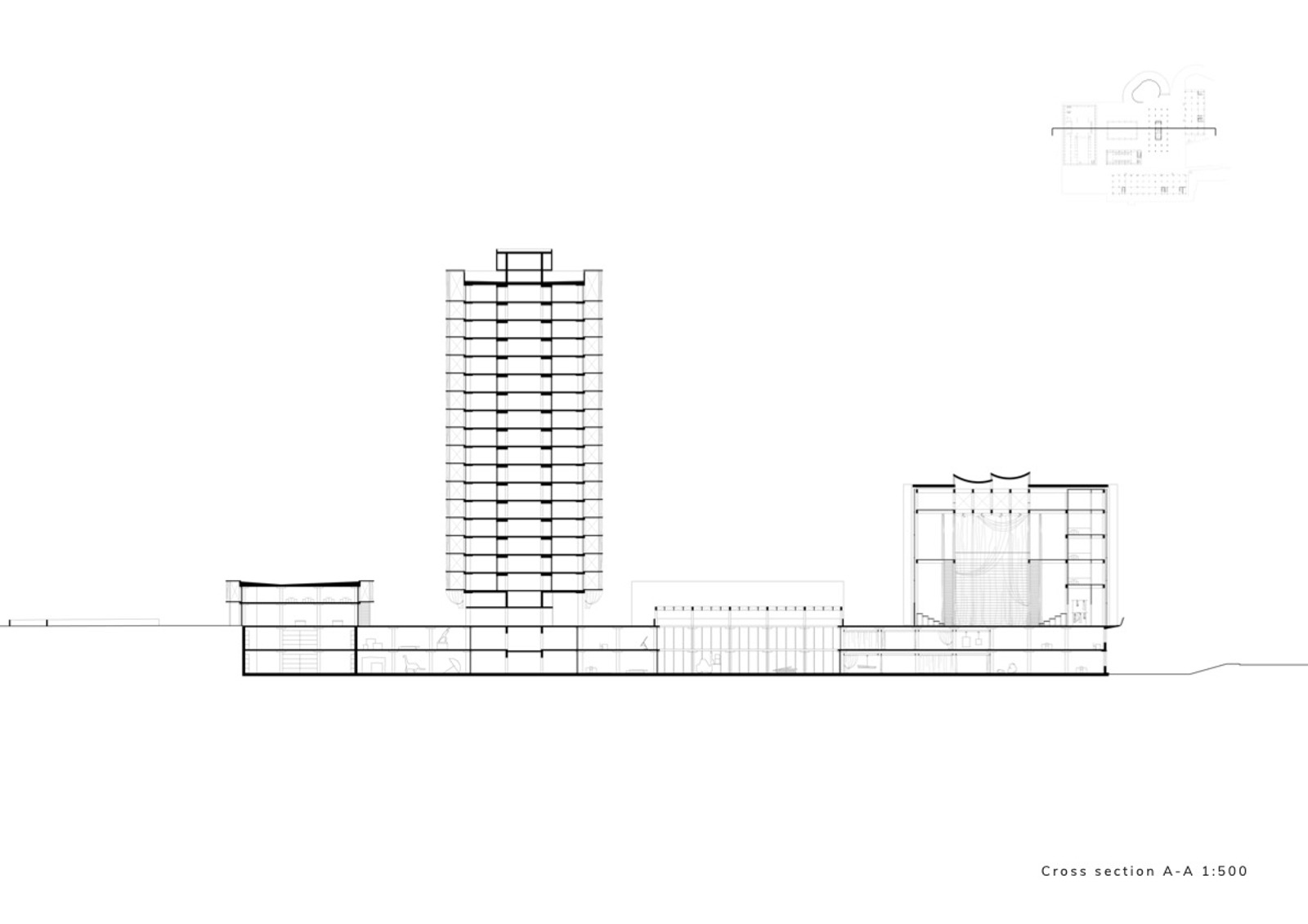Tverrsnitt teater og høyblokk på Økern i Oslo.