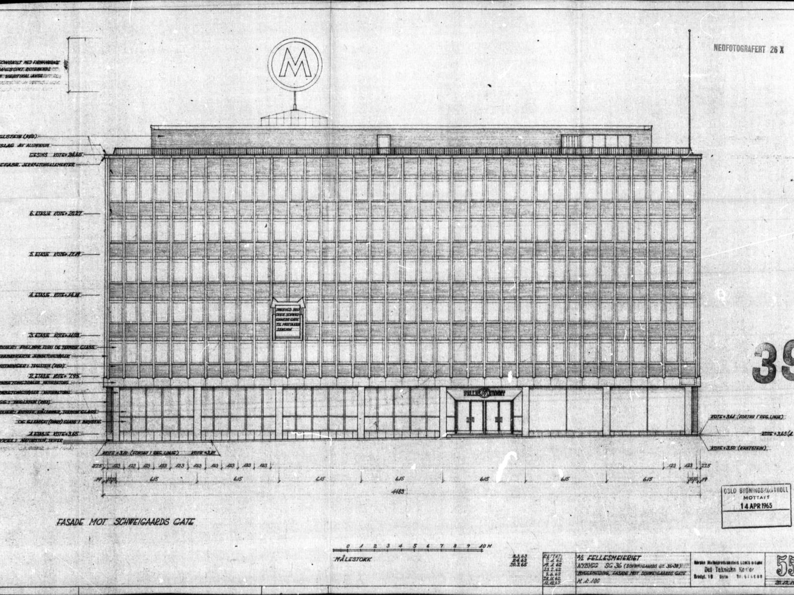 Originaltegning fasade Landbrukets hus sendt inn til Oslo bygningskontroll i april 1965.