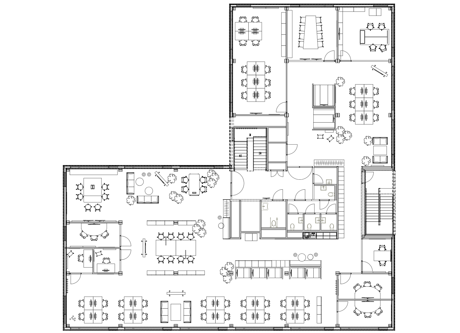I den åpne planløsningen, er faste båser for møter og avveksling med på å dele etasjene inn i mindre soner. Båsene ble levert av byggherre som fast inventar og er designet av I-d. Her er demonterbarheten i bygget tatt med videre inn i interiøret på en spennende måte. De er åpne på den ene siden og har vegger og tak med polstrede sittebenker og bord. Både båsene og møblene er fleksible og kan enkelt demonteres.