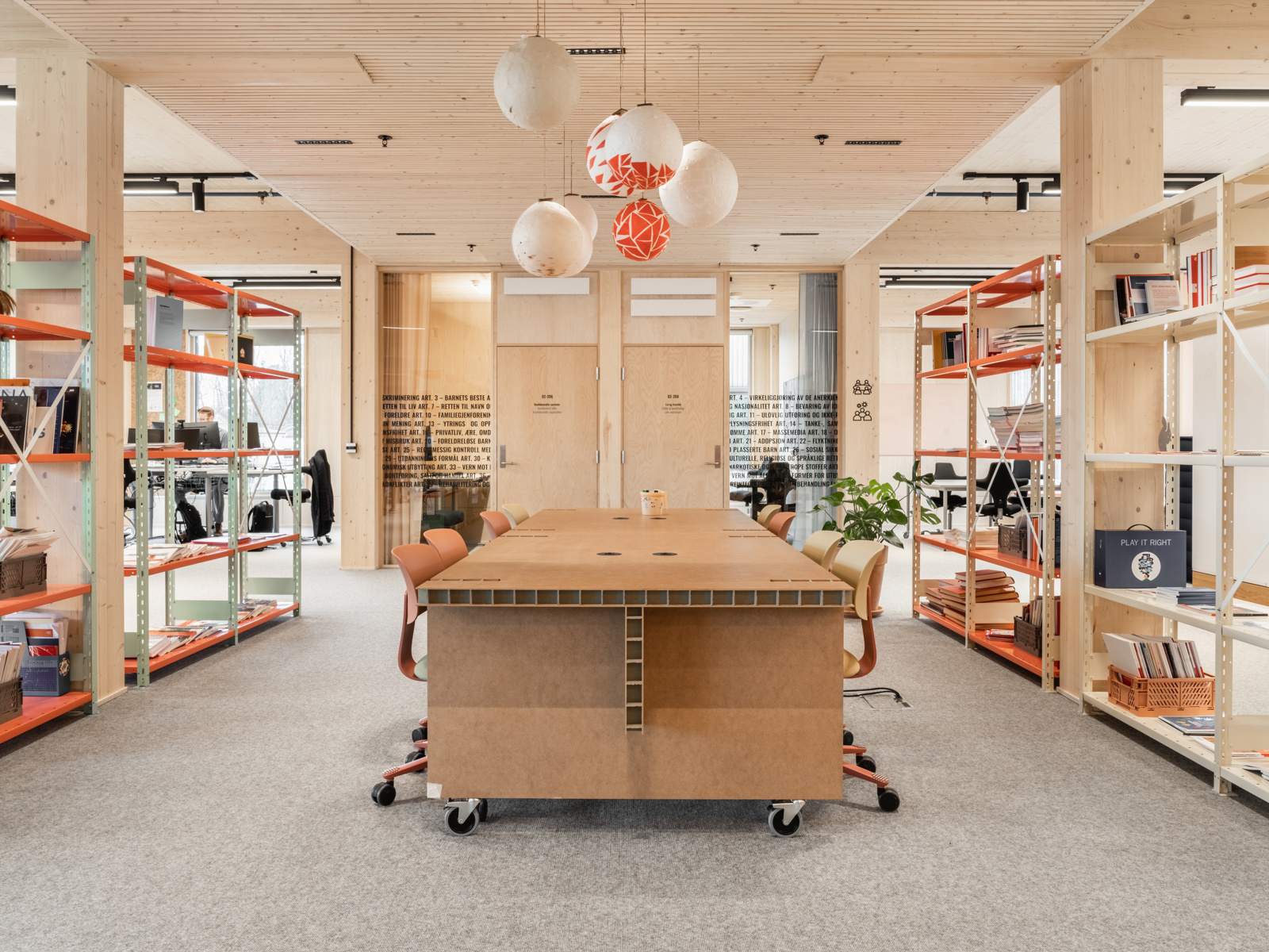 Det eksisterende interiøret i Redd Barnas gamle lokaler var preget av sort, hvitt og rødt. Kontorpulter og kontorstoler ble ombrukt. Pultene ble kortet ned så mye understellet tillot, til 120cm bredde. Stolene ble sendt på overhaling og reparasjon og har fått ny-garanti på to år. Skilleveggene rundt kontorpultene, skiller seg ut og er både et taktilt og sanselig innslag.