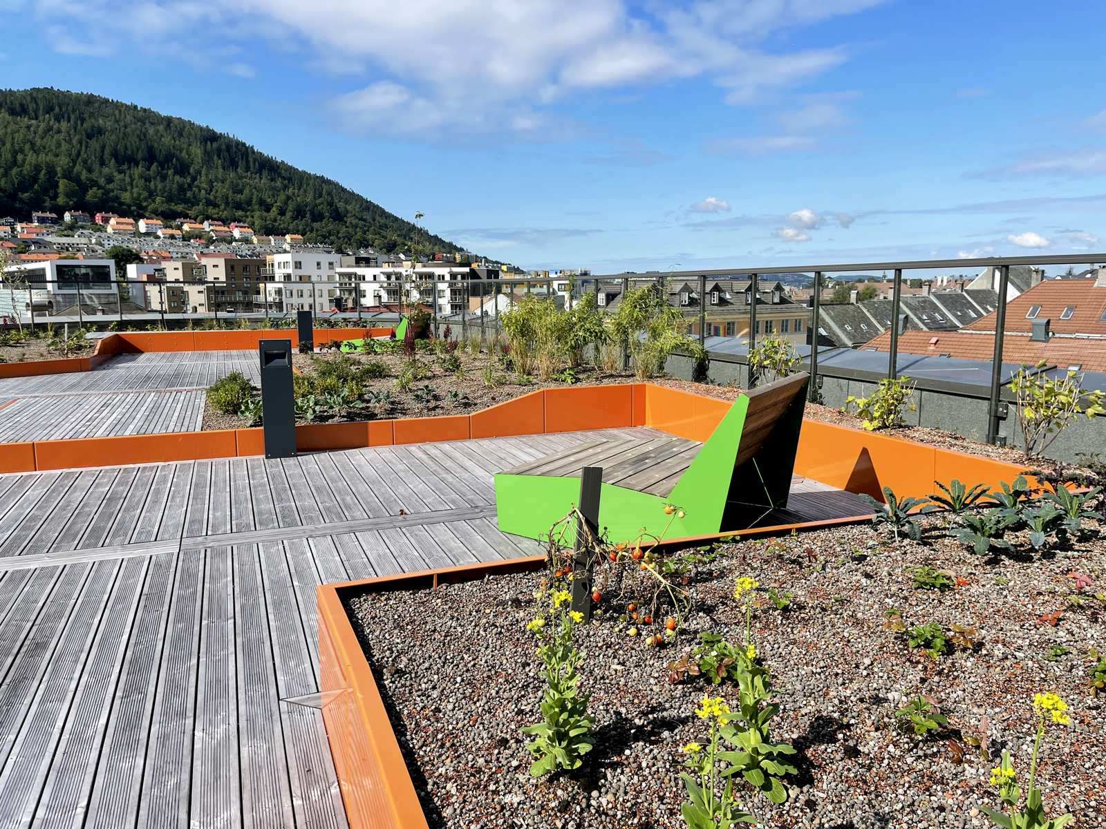 Foto: Øystein KlakeggDeler av den eksisterende bebyggelsen på tomten er bevart, og gir prosjektet særpreg og historisk forankring. Andre miljøtiltak i prosjektet inkluderer bruk av grønne tak, fjernvarme, varmegjenvinning innad i bygget, prosjektering som sikrer energiklasse A for store deler av bebyggelsen, BREEAM Excellent for kontorvirksomhet, svært lav parkeringsdekning, og valg av plantearter som stimulerer biologisk mangfold og skaper trivelige uterom. Ved å samle viktige hverdagsfunksjoner reduseres også behovet for bilbruk for både beboere i prosjektet, nærmiljøet og forbipasserende/ gjennomreisende. Prosjektet styrker på denne måten gåbyen Bergen, og stimulerer til aktivitet som kan gi positive ringvirkninger i nærmiljøet.