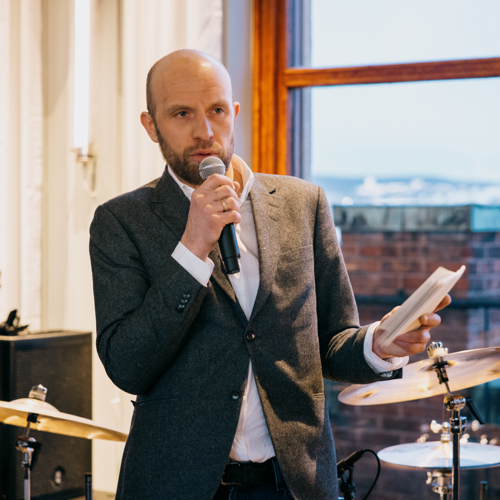 Gaute Brochmann, redaktør i årets tidsskrift. Her under lanseringsfesten av Arkitektur i mars, 2023.