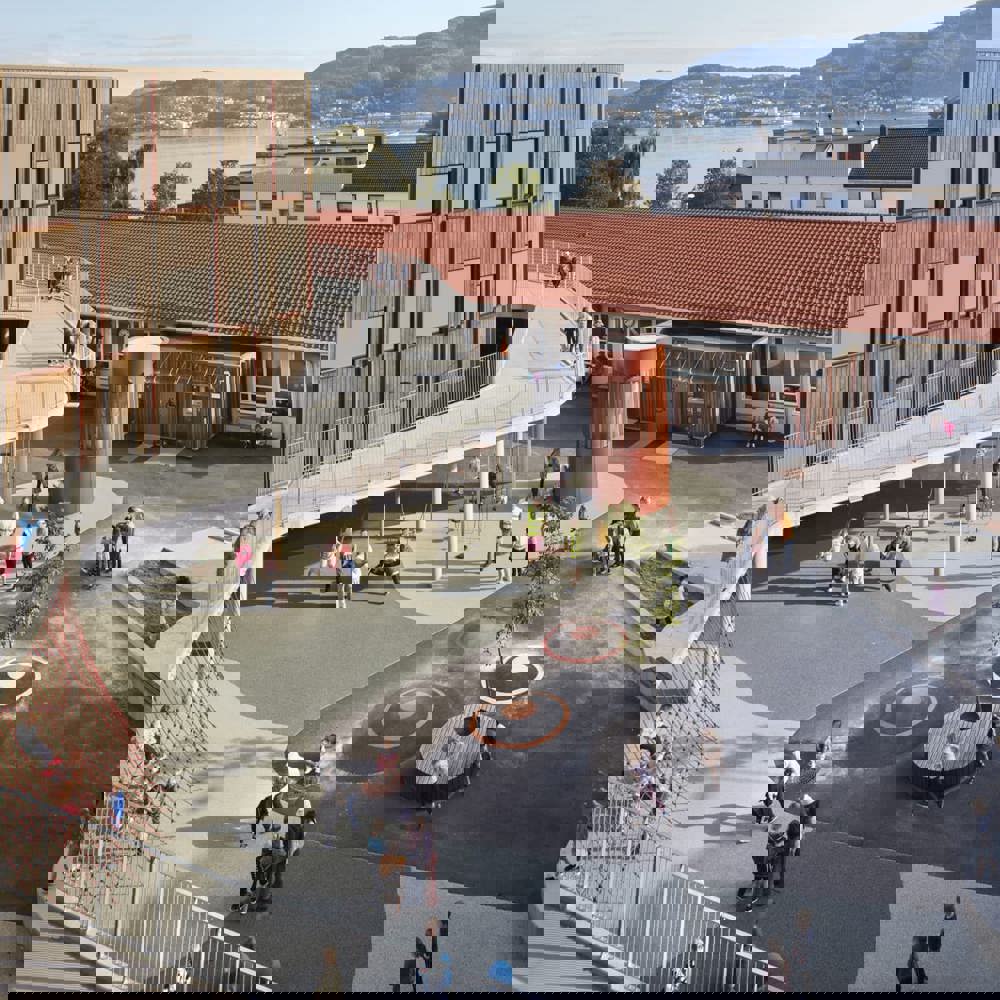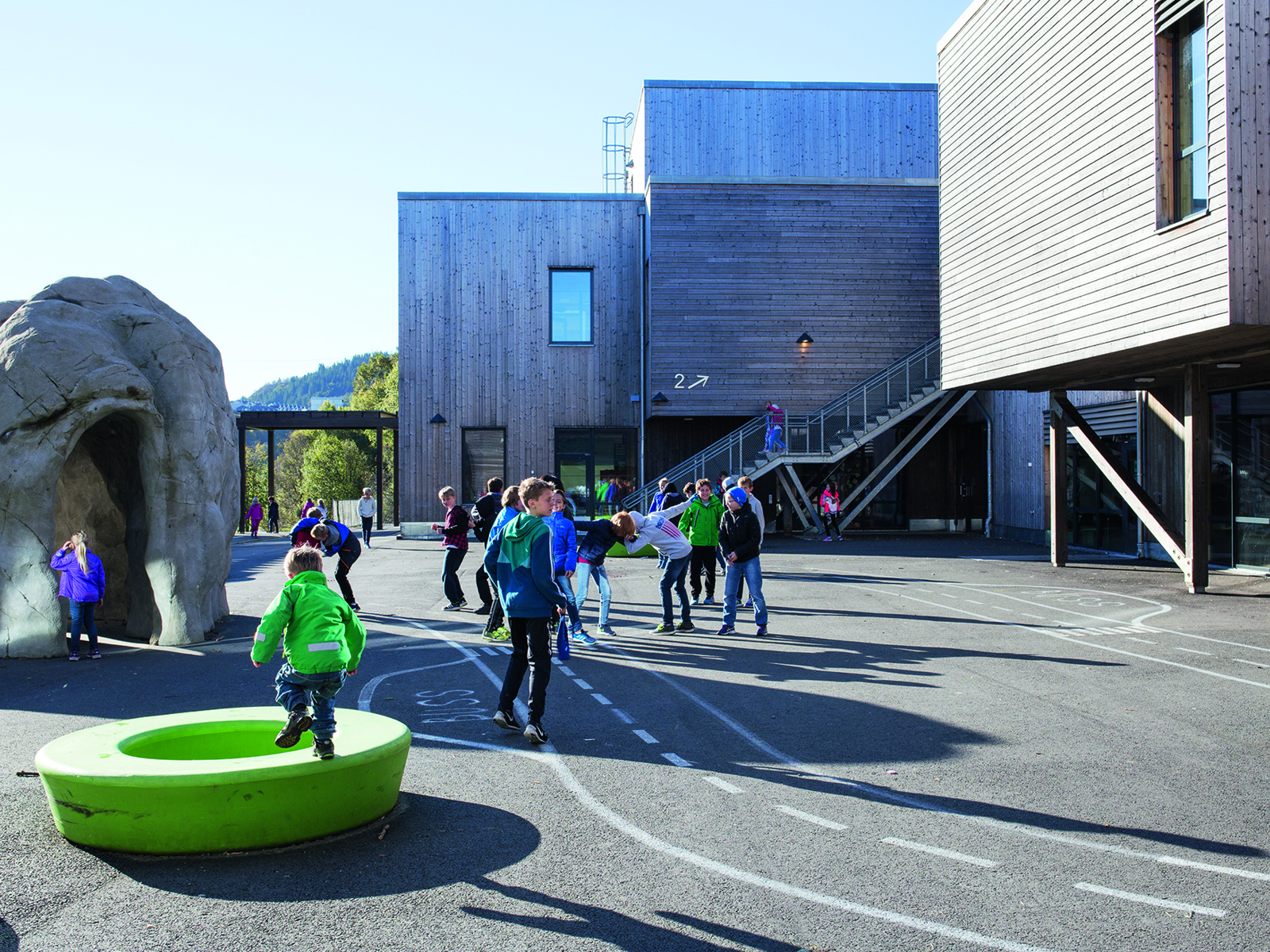 På Ulsmåg skole i bydel Fana i Bergen er et langstrakt uteområde bundet sammen av en aktivitetsgate. Skolen er Norges første i massivtre og er tegnet av Ola Roald Arkitektur (nå Holar). Norconsult har vært landskapsarkitekt.