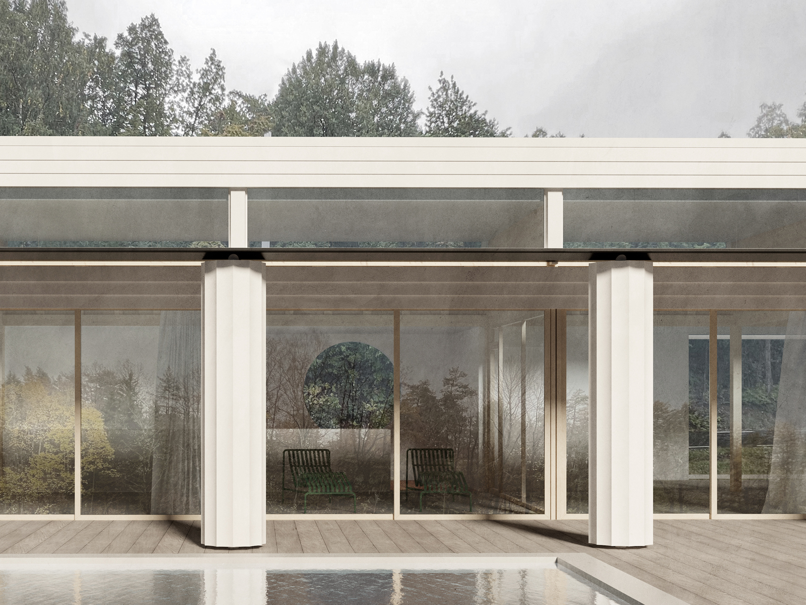 Husets flate tak sørger for at nybygget underordner seg hovedhusets takprofil og silhuett. Treningspaviljongen er tenkt bygget som en limtrekonstruksjon og består av et allrom med store glassflater og skyvedører mot syd og taklys via et lanterne. Fasade mot sør består av store glassflater og et romslig takutstikk som står på store søyler. Dette overdekkede arealet gir solavskjerming for allrommet innenfor og danner en søylegang ut mot soldekke og basseng. Mot byggets nordside danner store glassflater lysåpninger mot bergveggen og vegetasjonen i bakkant.