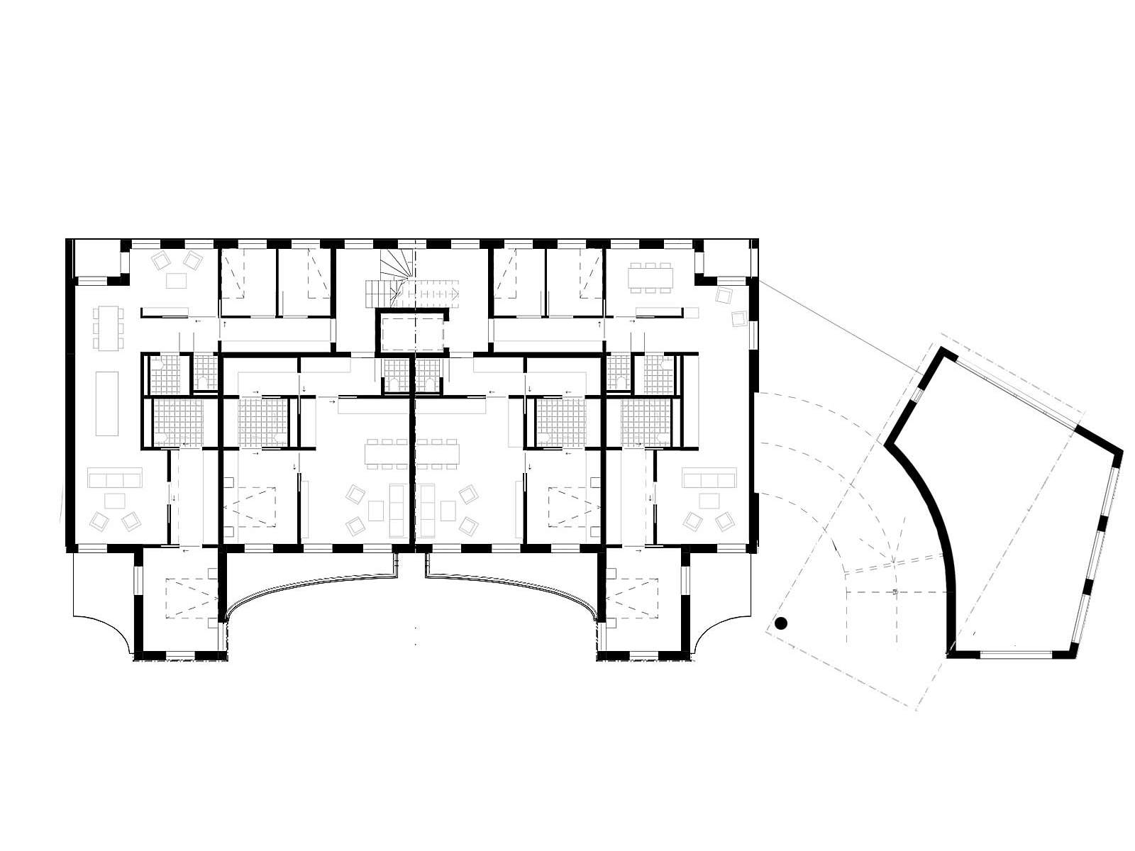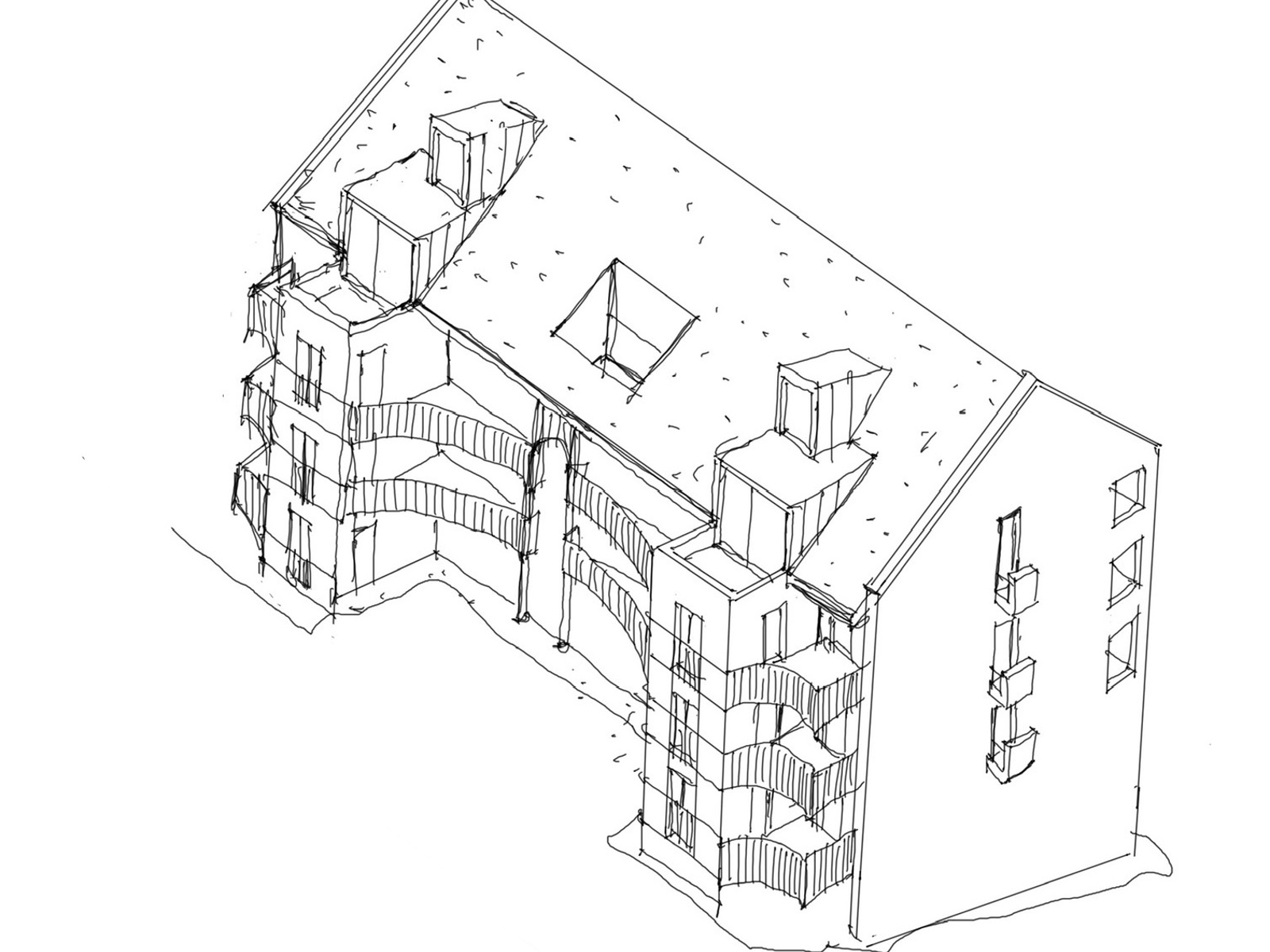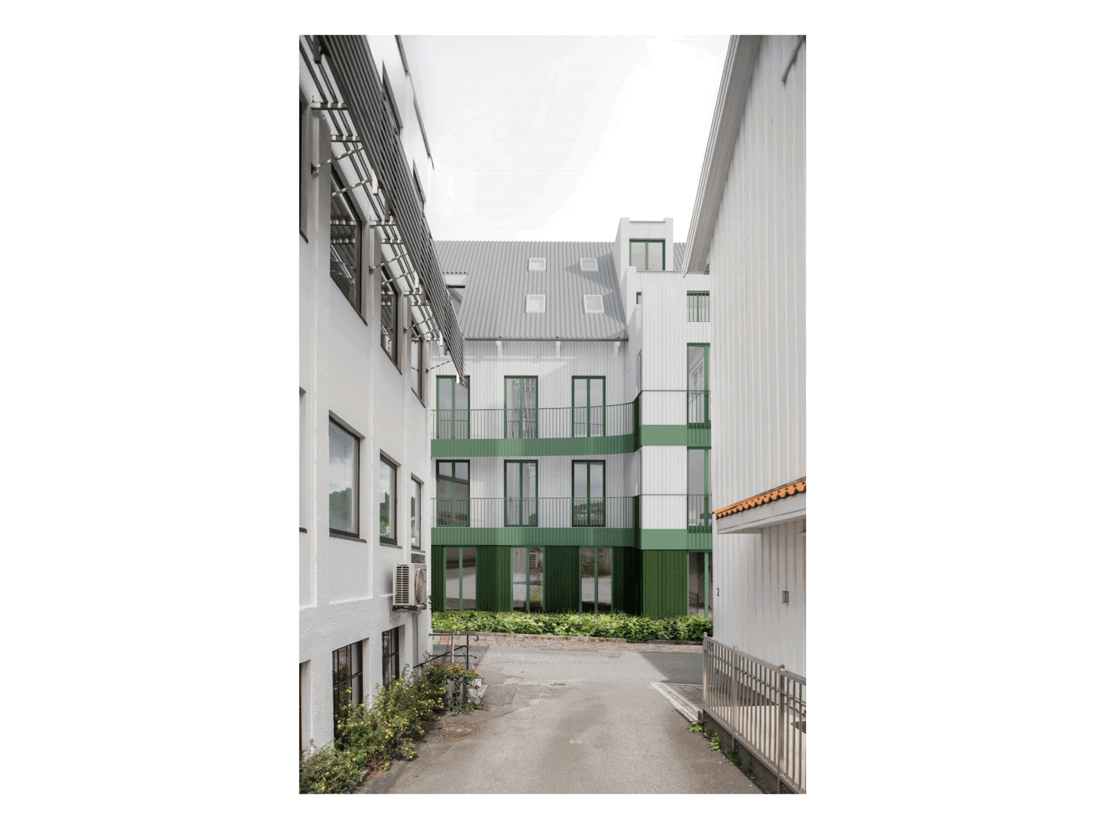 Prosjektet inneholder to volumer, der det største inneholder 15 leiligheter på mellom 57 og 127 kvadratmeter, og parkering i kjelleren.