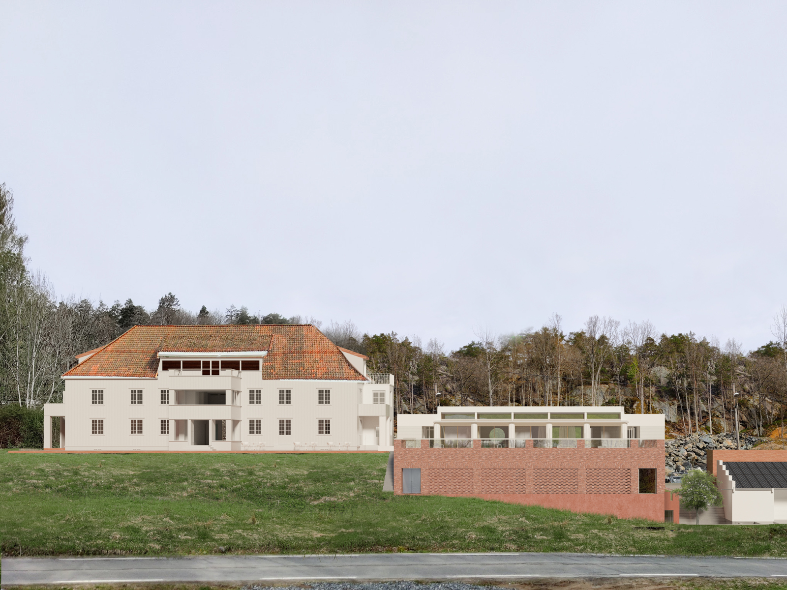 Et annet av Kastler Skjeseths prosjekter i Tvedestrand er et gammelt eldrehjem (til venstre) fra 1920-tallet som bygges om for et eiendomsselskap. Bygget får også en treningspaviljong og gymsal (i midten).
