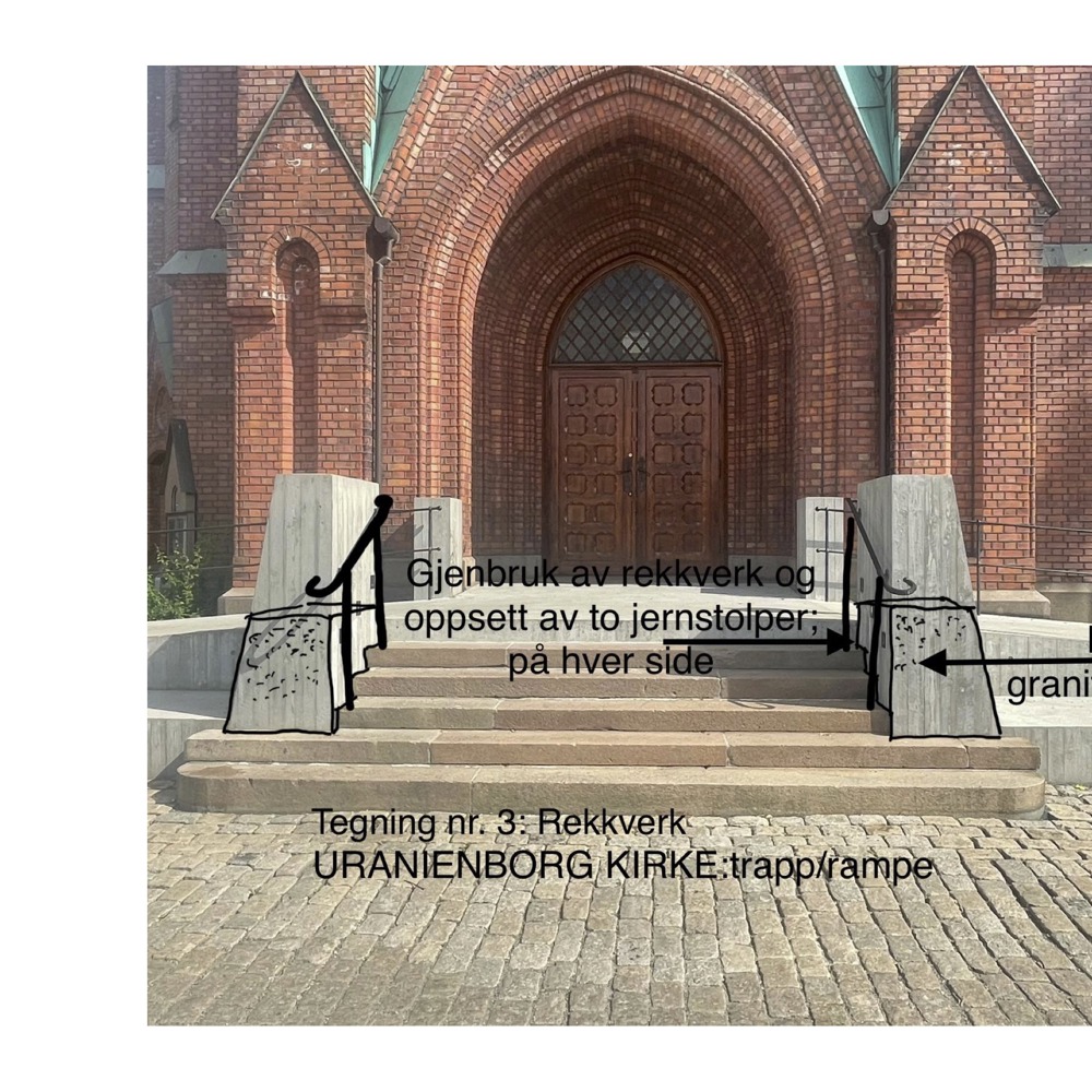 Forslaget fra Fellesrådet er at meglerne fjernes og erstattes med håndløpere helt til kirkeveggen, mens pylonene i forkant erstattes med noen som er lavere og i granitt i stedet for betong.