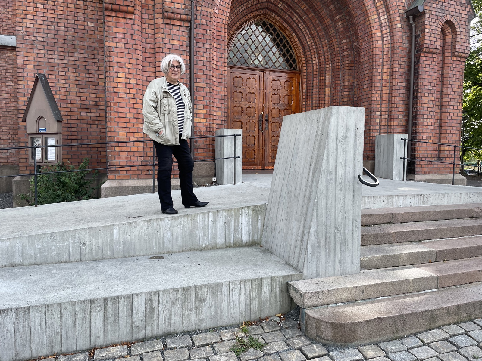 Foto: Torgeir Holljen ThonHelt siden Uranienborg kirke ble bygget i 1886, har alle som har villet inn kirkens dører måttet forsere seks trappetrinn i granitt. I 1971 dukket det første forslaget opp til trappefri adkomst inn til kirkerommet, for også å la rullestolbrukere og de som er dårlige til beins kunne få komme og høre det glade budskap. Verken det, eller andre forslag gjennom årene førte fram. Trappen har bestått.