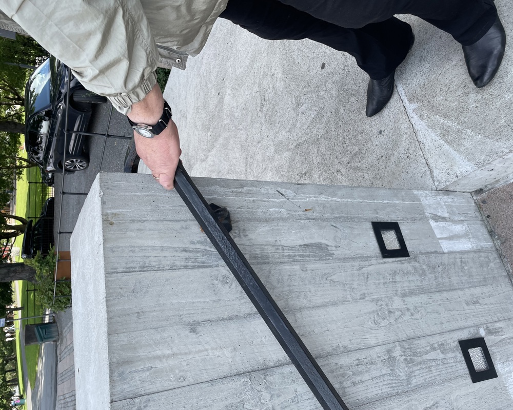 Dahle viser hvorfor betongen må gå 10 centimeter over håndløperen for at det skal være behagelig å føre hånden langs den.