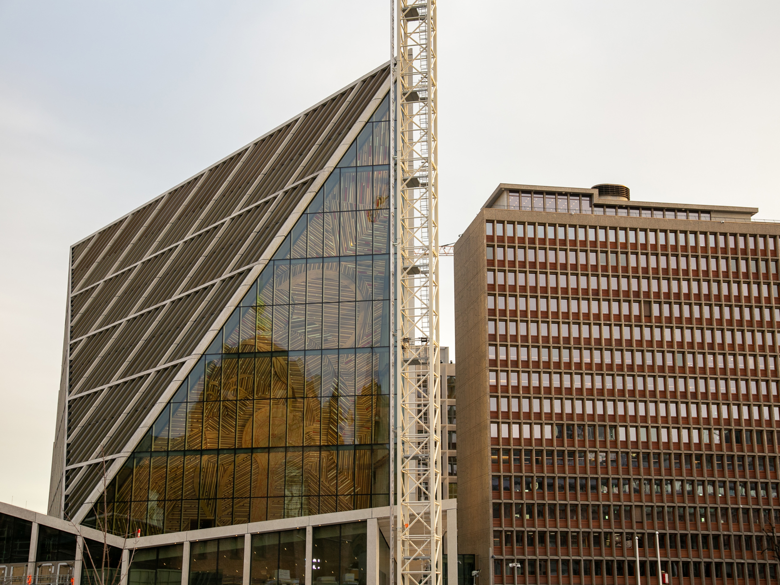 Kunstverket er godt synlig fra Akersgata. Til høyre Erling Viksjøs høyblokka fra 1958.
