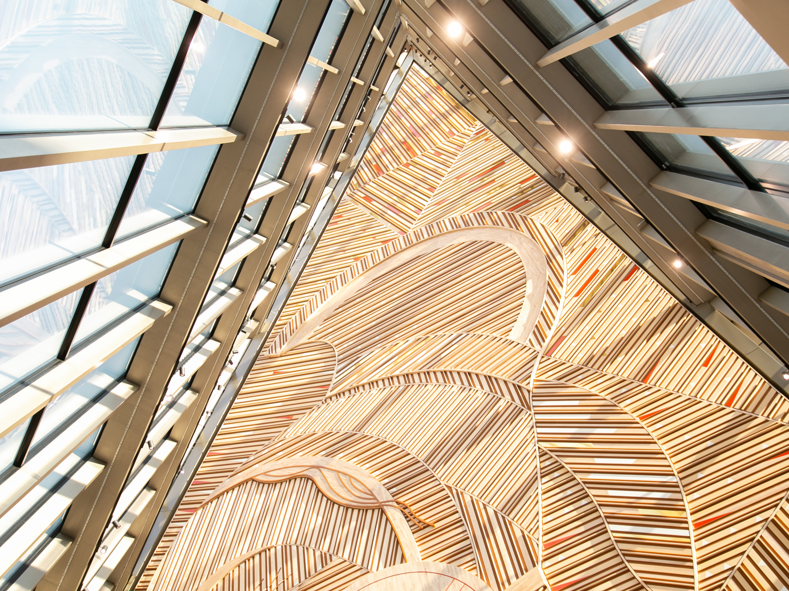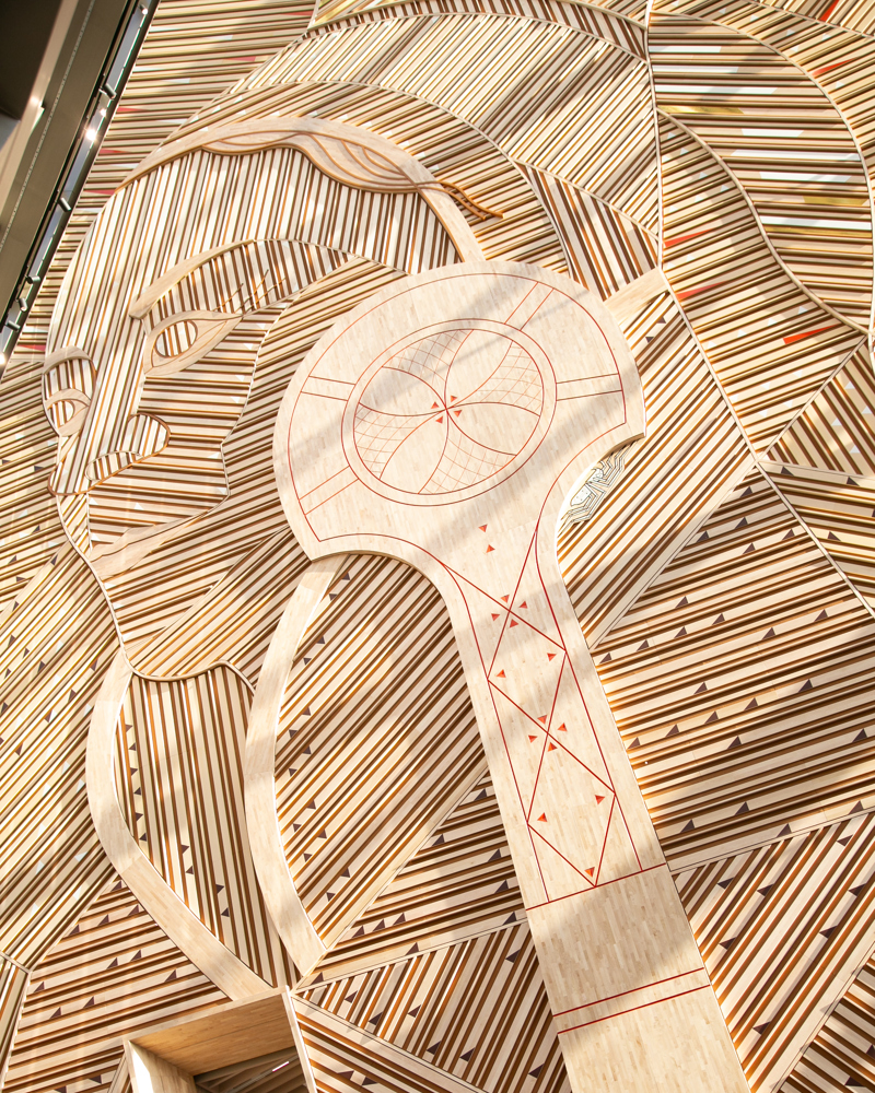 Tirsdag var det avduking av noe annet i prosjektet som også er enormt: Det 51 meter høye og 700 kvadratmeter store kunstverket AAhkA, signert samisk-finske Outi Pieski. Verket pryder, ja i det hele tatt er, den ene veggen i det såkalte pyramiderommet i inngangspartiet til nye A-blokka.