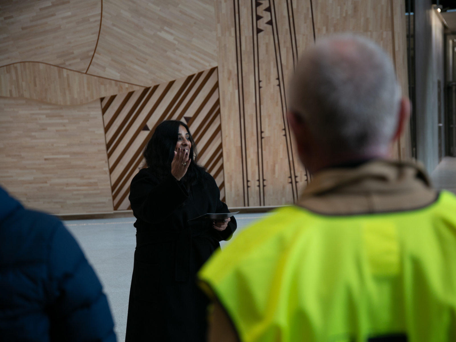 Kultur- og likestillingsminister Lubna Jaffery var innom under avdukingen. – For et rom og for et kunstverk. Det er fantastisk å se det ferdig og på nært hold, sa ministeren. I forgrunnen, Nordic-arkitekt Gudmund Stokke.