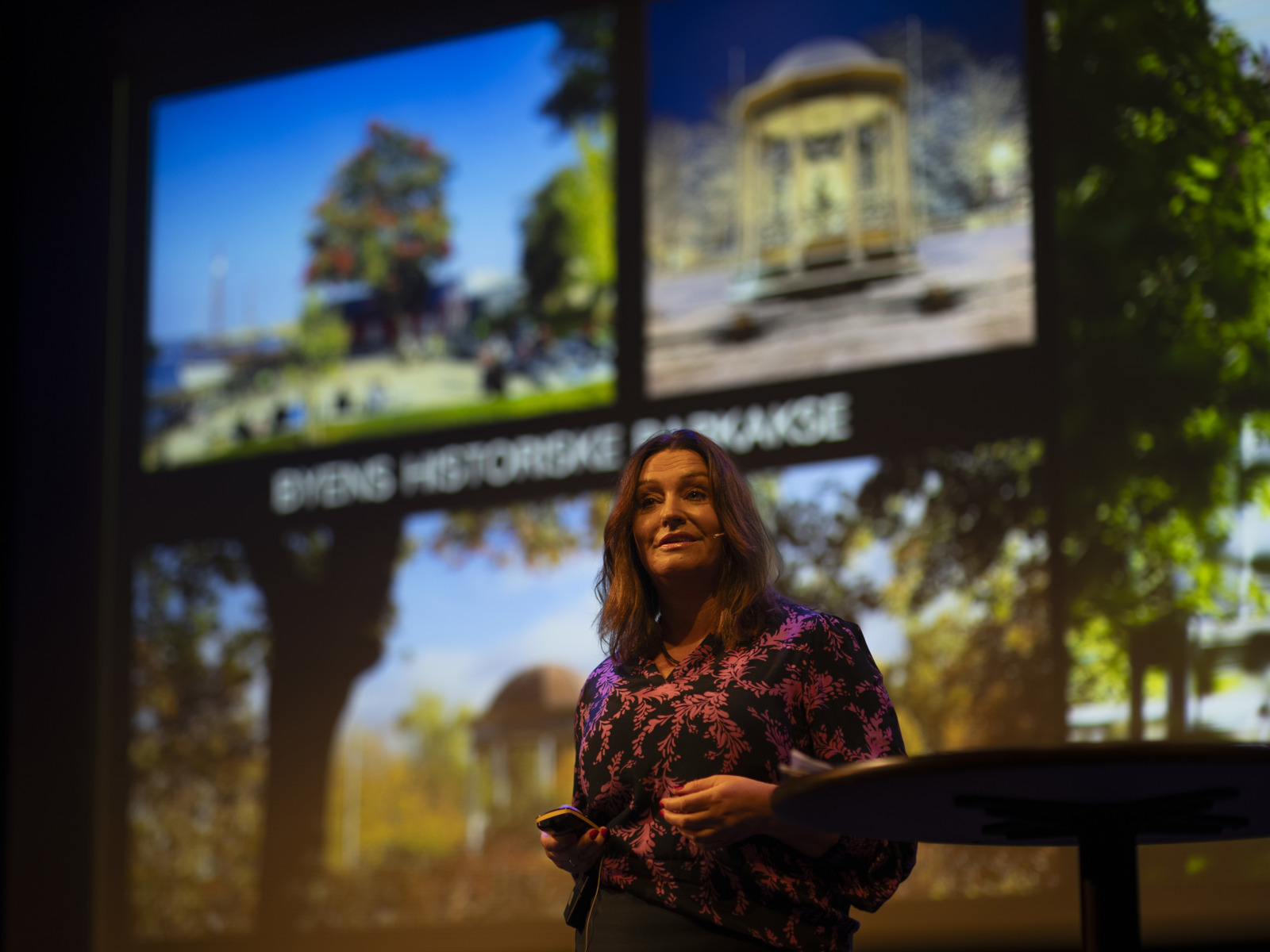 Tove Nordgaard, byantikvar i Levanger, på scenen under Bylivkonferansen.