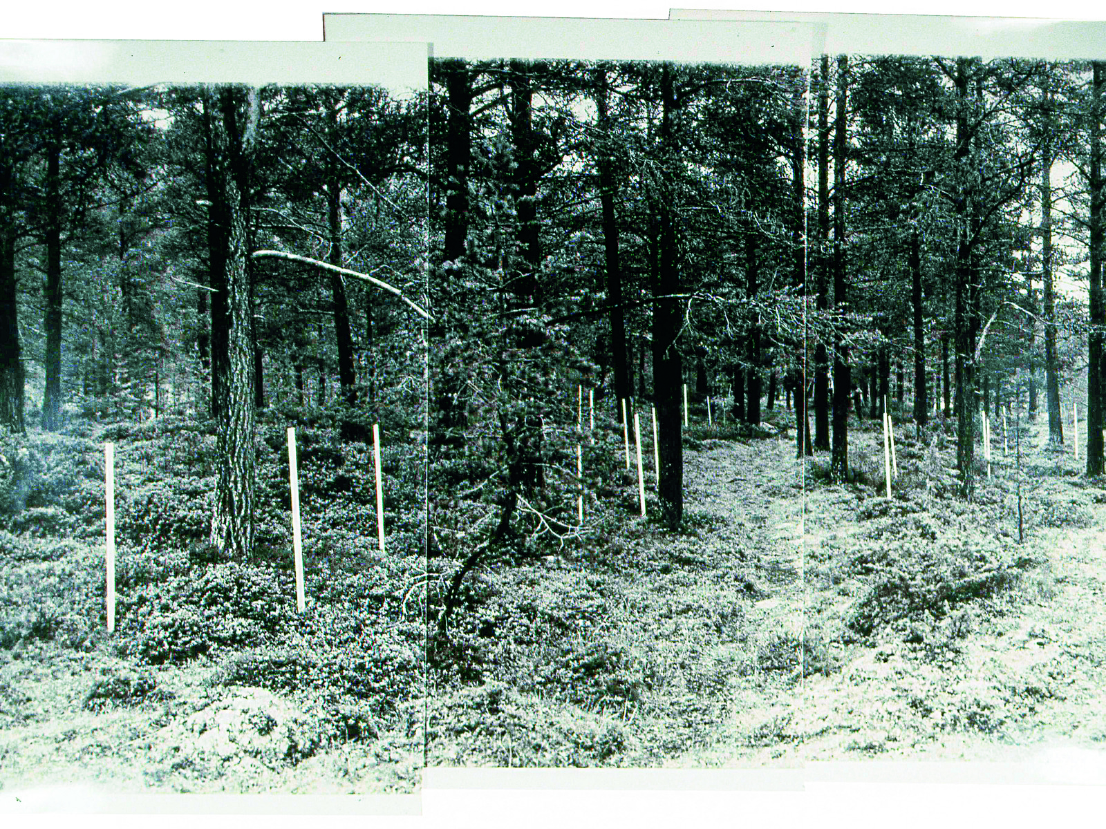 Slik så tomta ut i september 1995. – Vi satte ut hele prosjektet skogen, med ca. 400 pinner. Disse ble målt opp og ble plantegningen til prosjektet, forteller Jensen.