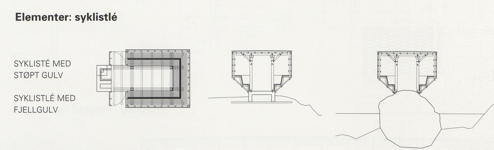 Også opprinnelig tegnet Jensen & Skodvin overnattingsskur for syklister. Disse ble imidlertid ikke bygget. Fra Byggekunst 8/1997.