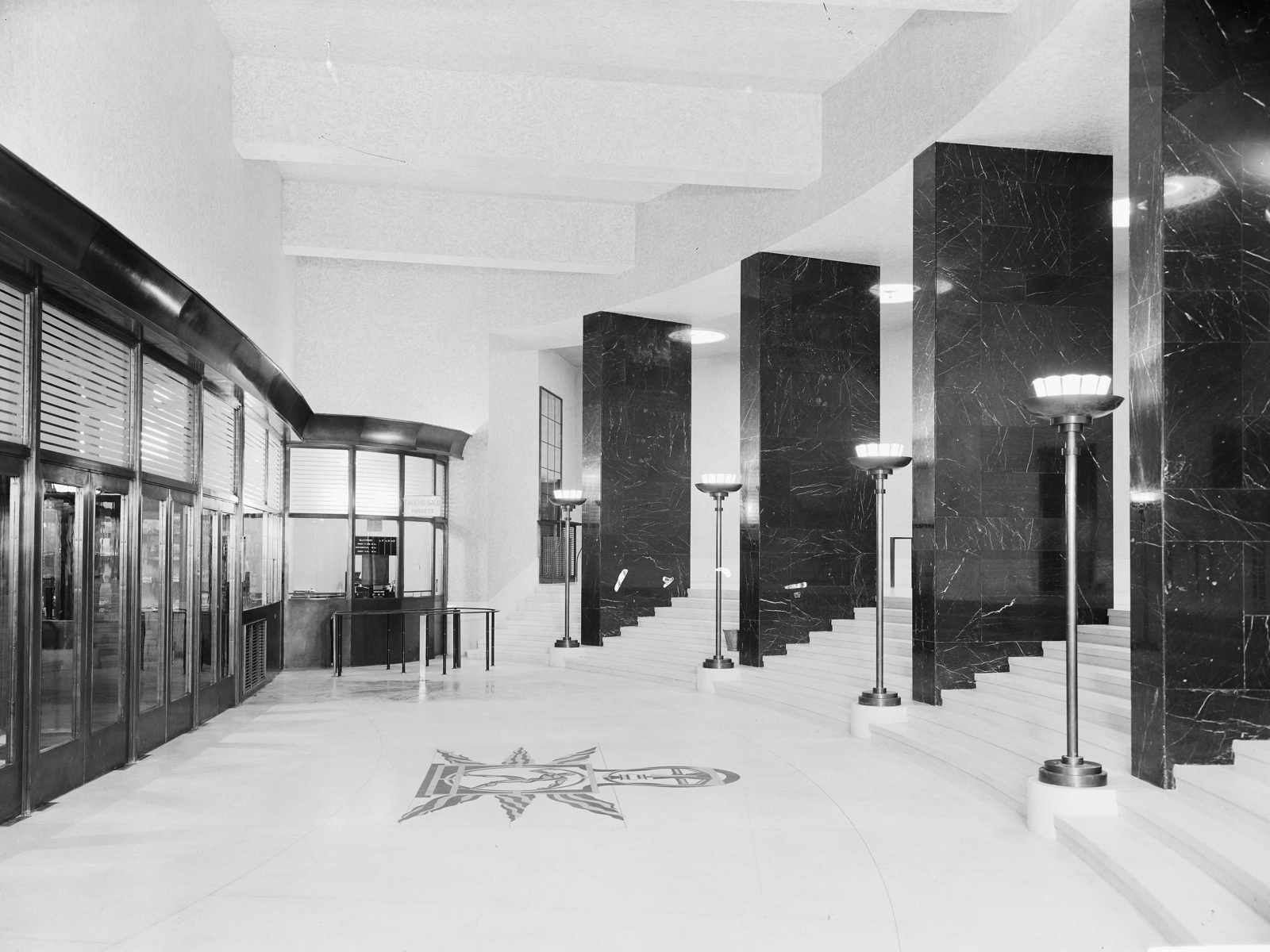 Even Smith Wergeland skriver om hvordan norsk brannvernlovgiving har blitt stadig mer komplisert de siste 200 årene og også endret arkitekturen. Han bruker byggingen av Folketeaterbygningen på 1930-tallet som eksempel. Her bilde fra foajeen da bygget var nytt.