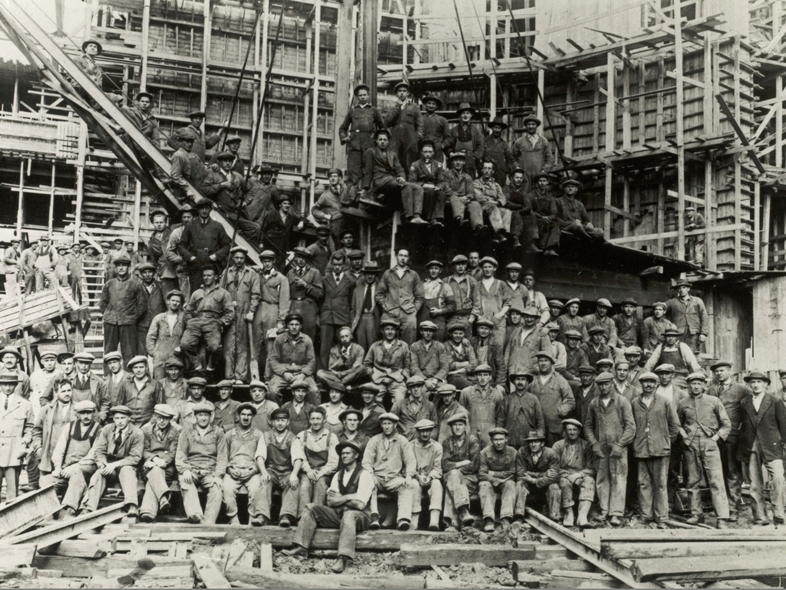 Byggingen av Folketeaterbygningen på Youngstorget i Oslo skjedde med arbeidskraft og materialer som ikke finnes i dag. Her bygningsarbeidere fotografert i 1933.