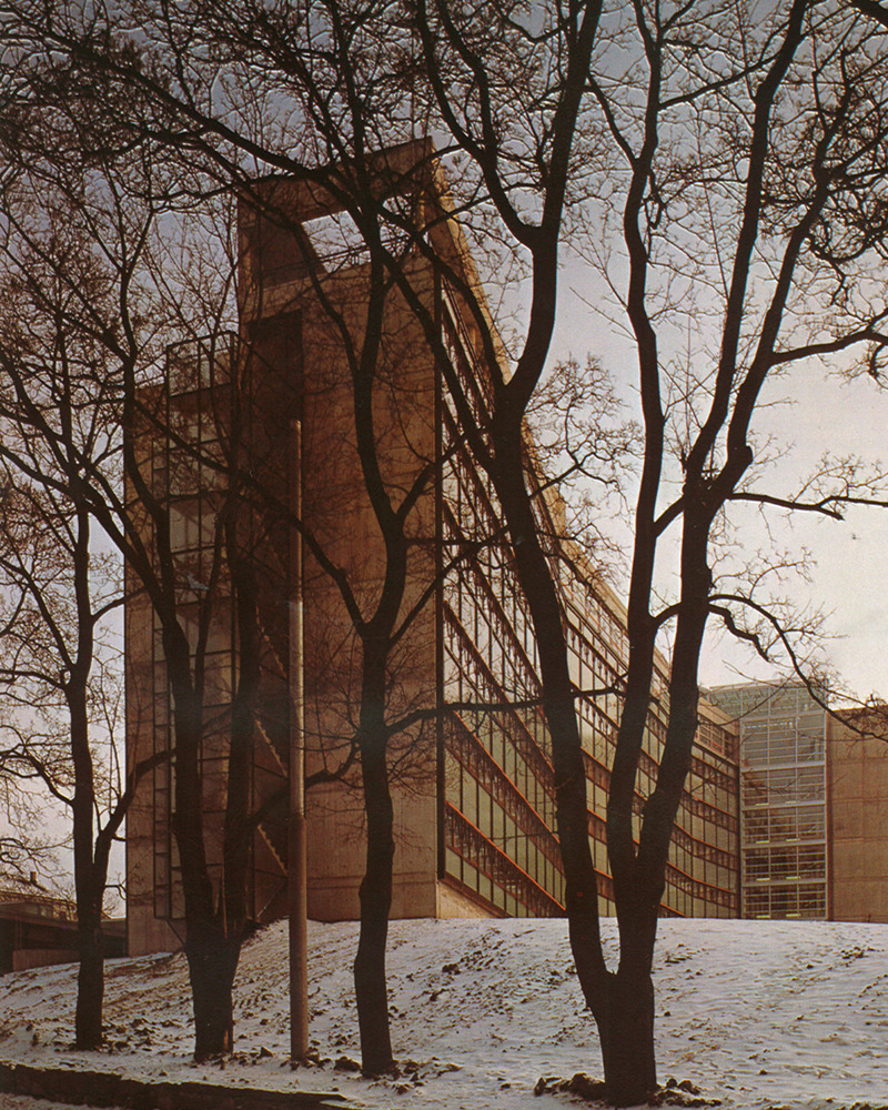 Politihuset i Oslo, slik det så ut da det stod ferdig i 1978. Bildet er fra oppslag i Byggekunst i 1979. Telje-Torp-Aasen fikk både Houens fonds diplom (1983) og Betongtavlen (1985) for prosjektet.