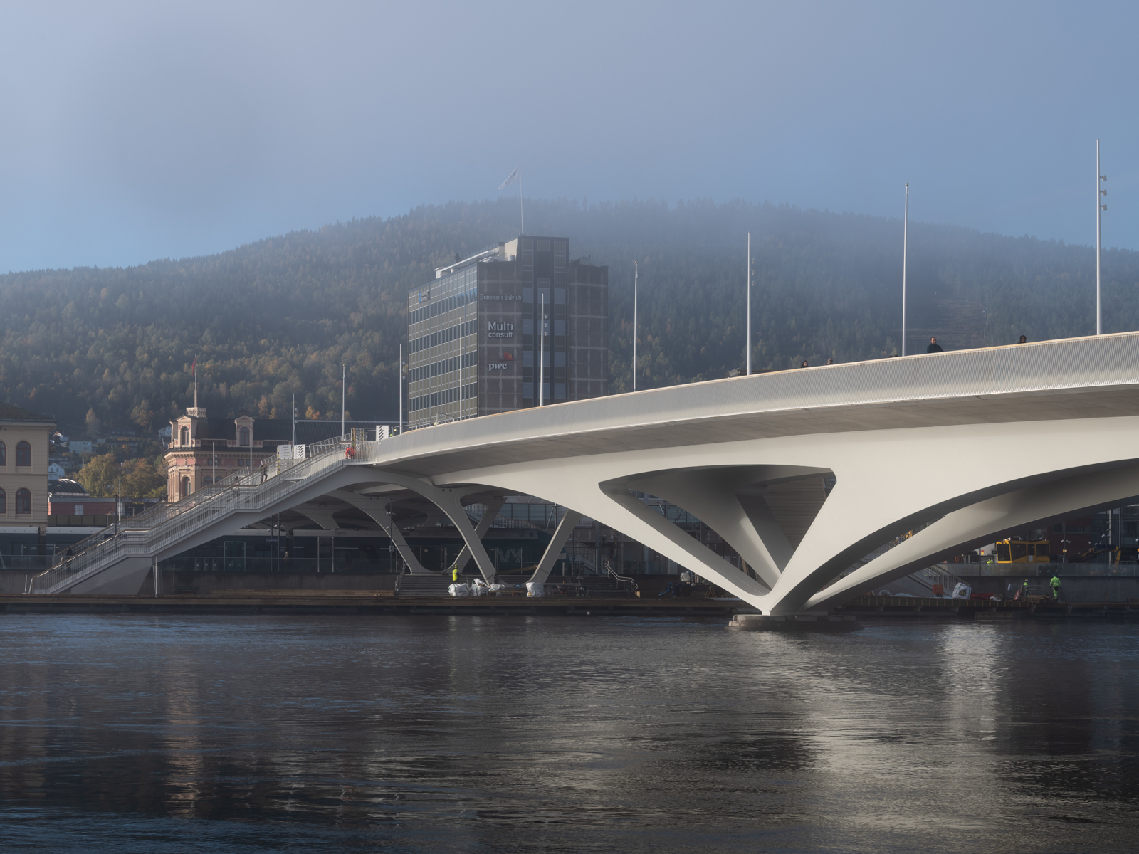 – De er begge lyse bruer over en mørk elv. Vi har jobbet for at bybrua, til tross for sin masse, skal ha en elegant letthet over seg. Sammen blir de til Drammens brufamilie, avslutter Solbjør.